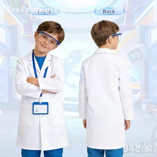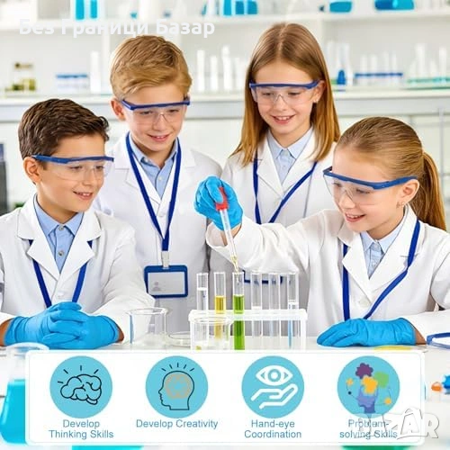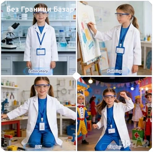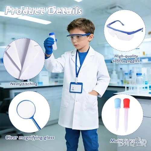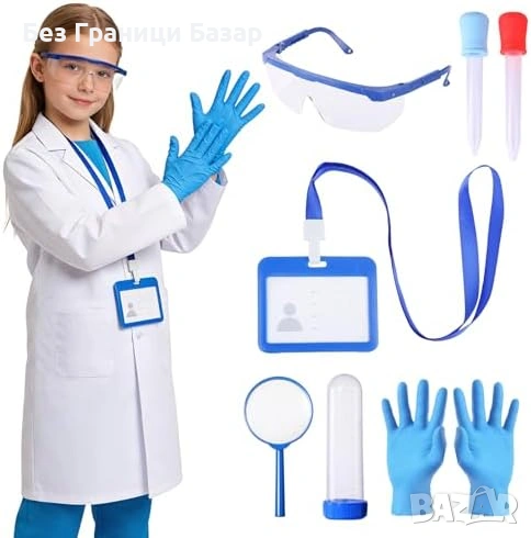 Включва: бяла лабораторна престилка, защитни очила, ID карта, лупа, ръкавици, 2 пипети, епруветка