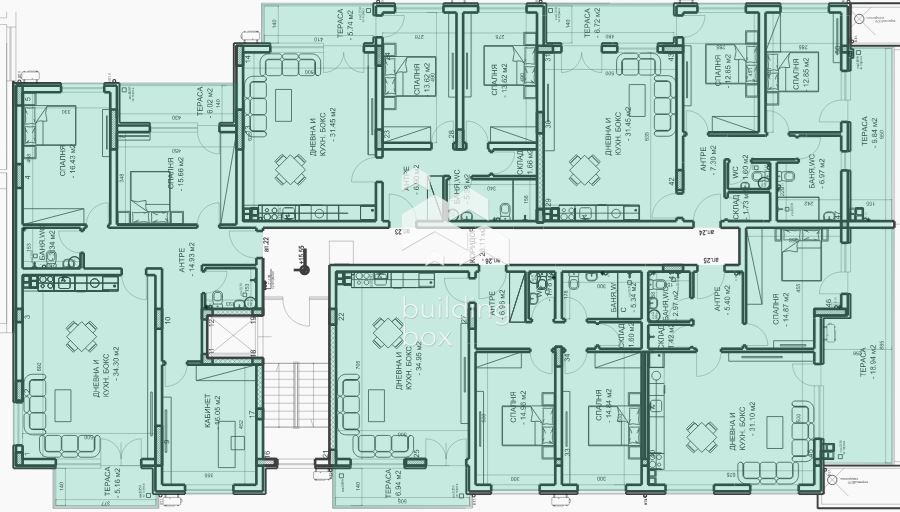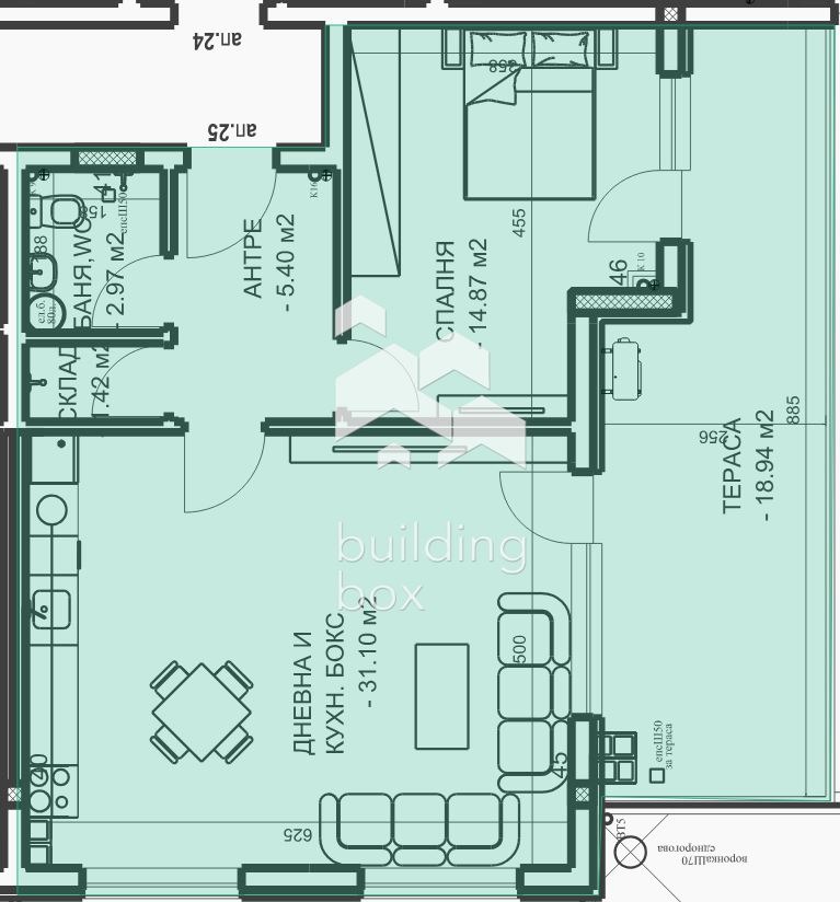 РАЗПРЕДЕЛЕНИЕ: Просторна всекидневна с кухненски бокс с площ 31,10 кв. м, спалня с площ около 15 кв. м, антре, баня с тоалетна, отделна тоалетна и просторна тераса с площ 19 кв. м.