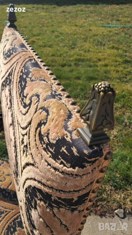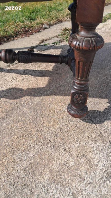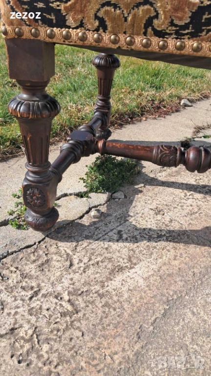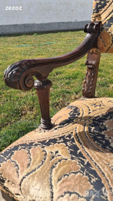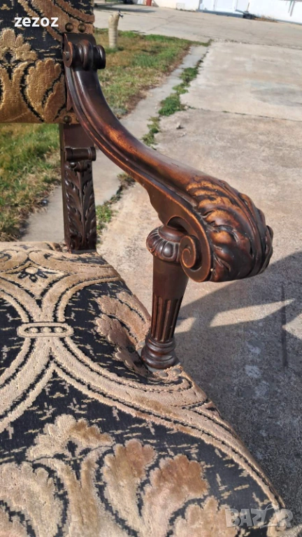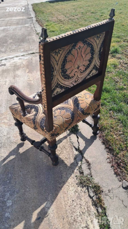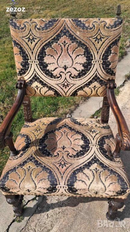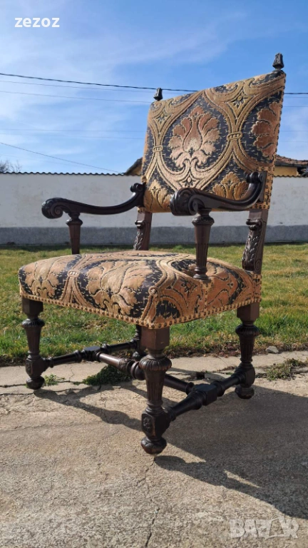 Антикварно голямо кресло тип-трон.Изработено от дъбов масив в стил комбиниращ елементи от Барок и Ренесанс.Обърнато е особенно внимание на всички конструктивни елементи-детаилна дърворезба,с акантови листа,архитектурни елементи-волути.дърворезбована е дори средната опора между краката.Както и месинговите орнаменти завършващи цялостната визия на креслото.Седалката е с ремъци и пружини и пълнеж от слама.Дамаска е в много добро за годините състояние.Размери-
