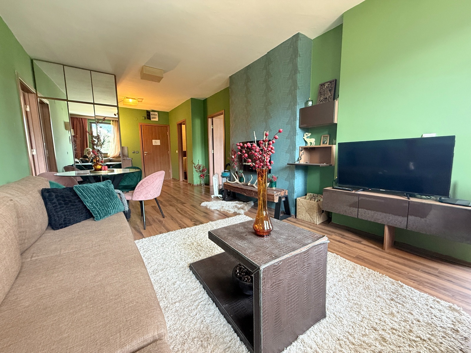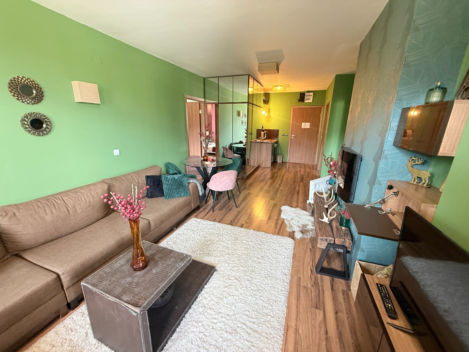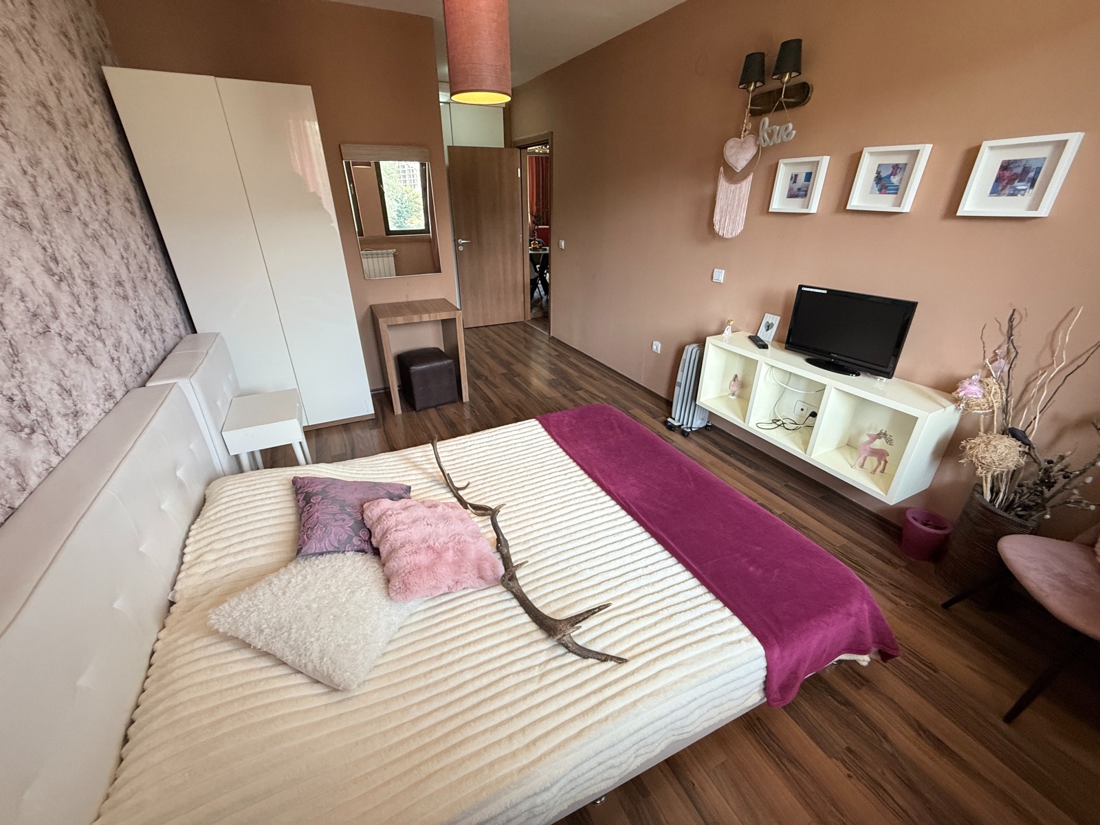 Апартаментът е напълно обзаведен по луксозен стандарт , с елегантен интериорен дизайн и внимание към детайла, което го прави идеален както за дом, така и за инвестиция под наем.