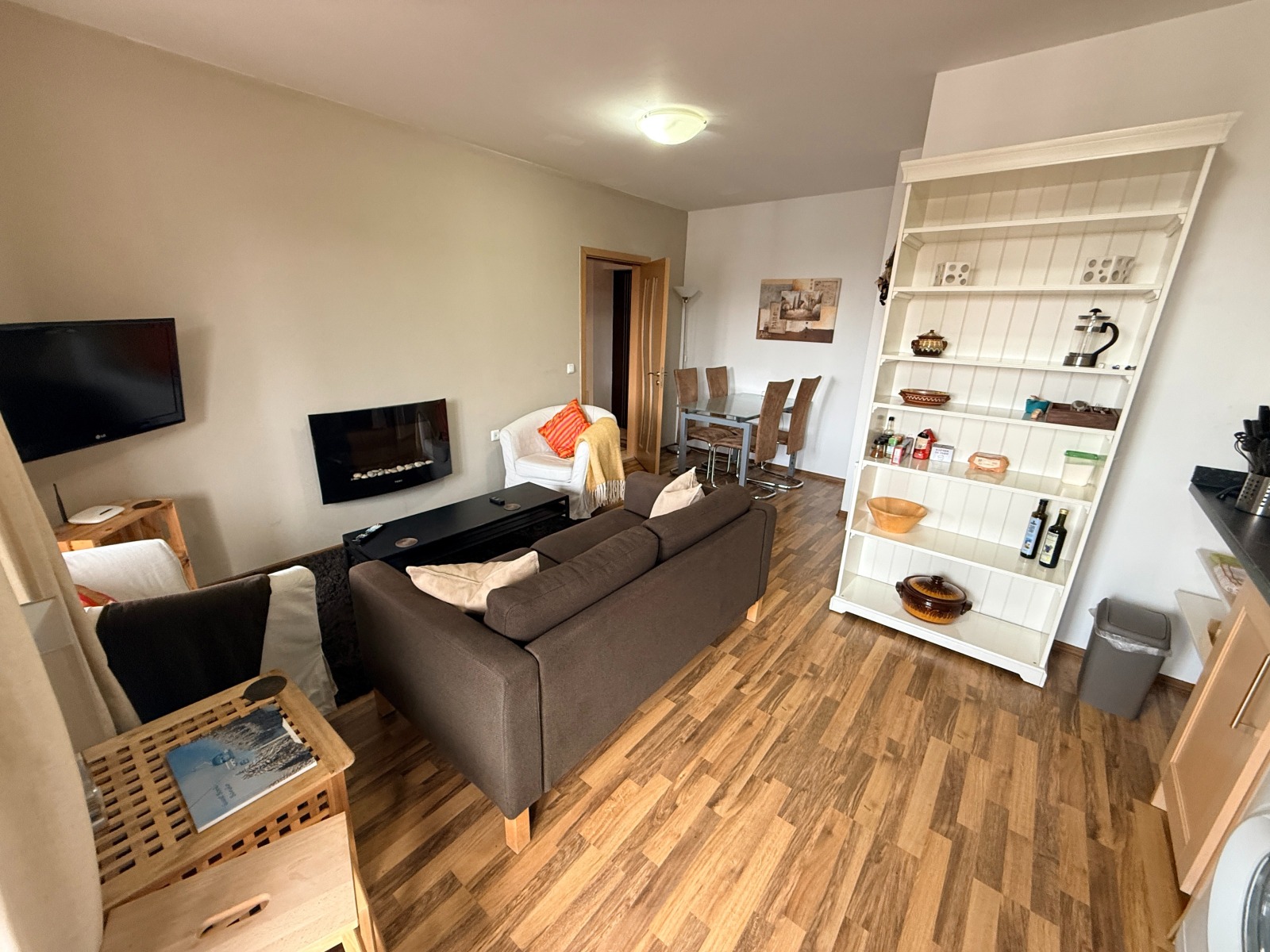 Хол с разтегателен диван, телевизор, масичка за кафе