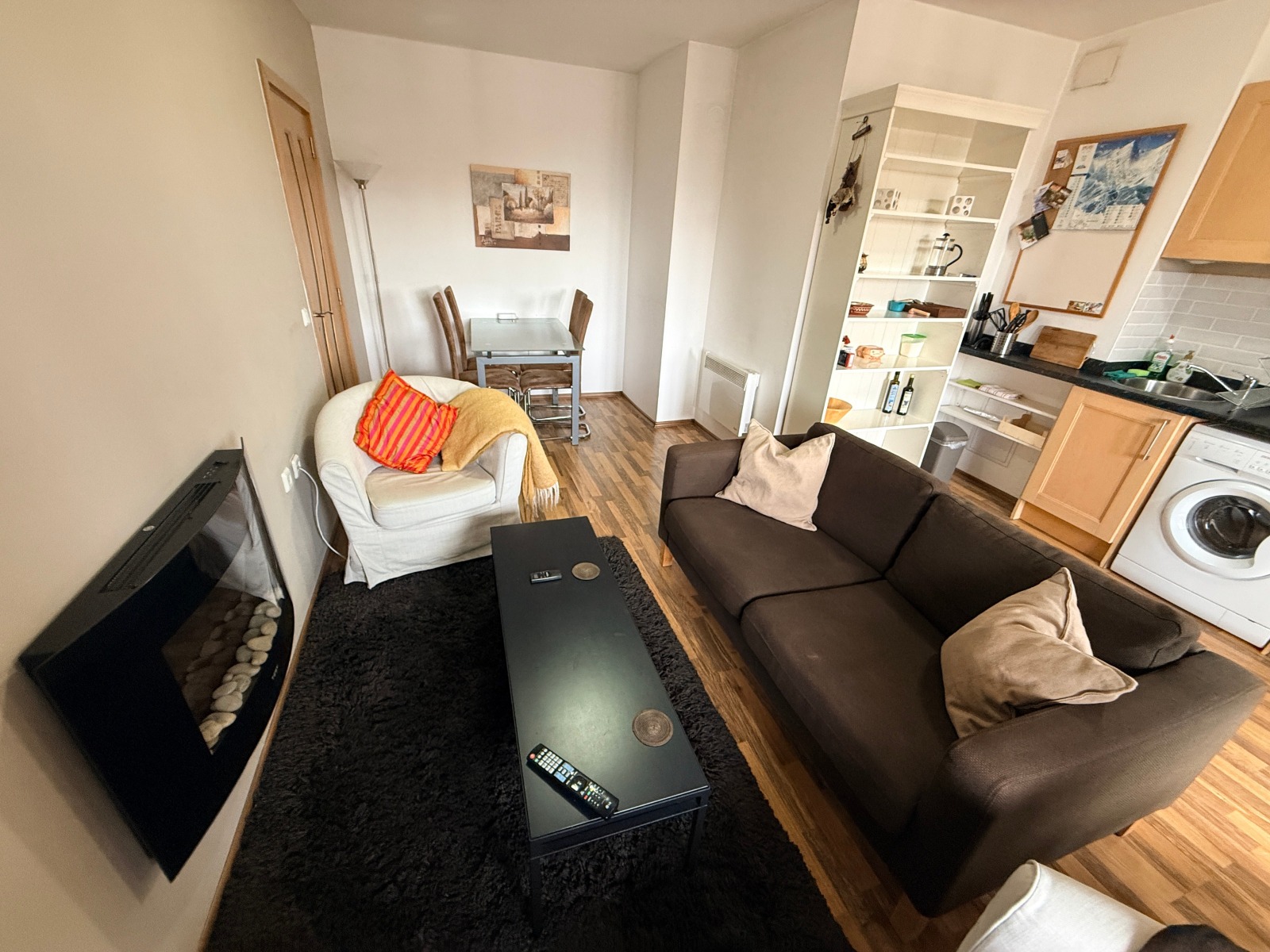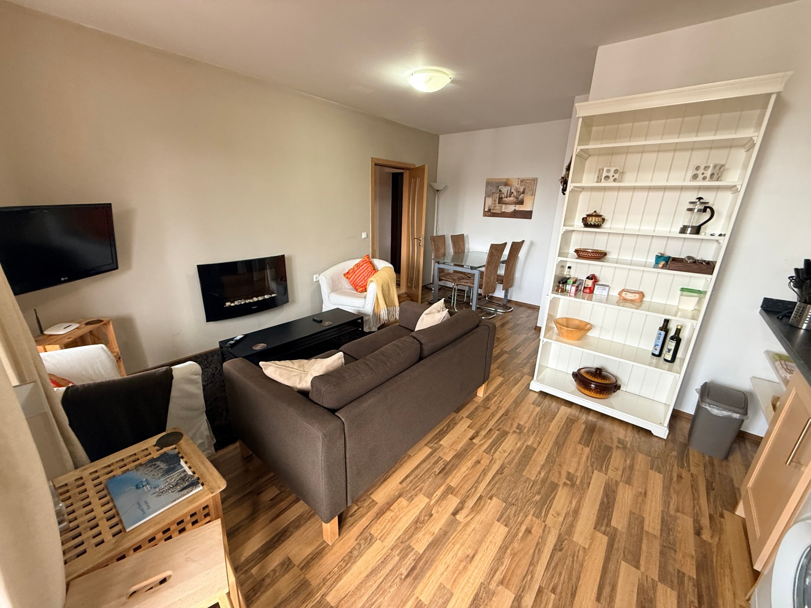 Всекидневна с разтегателен диван, телевизор и холна маса