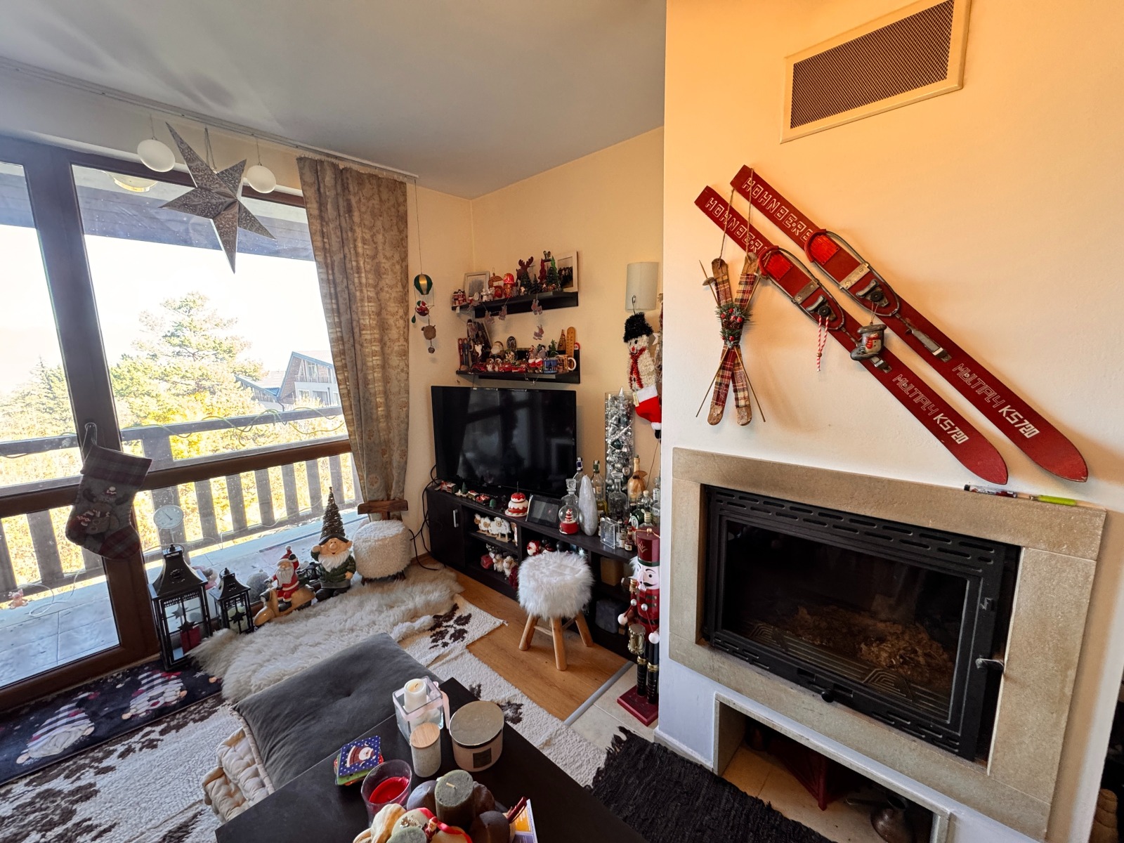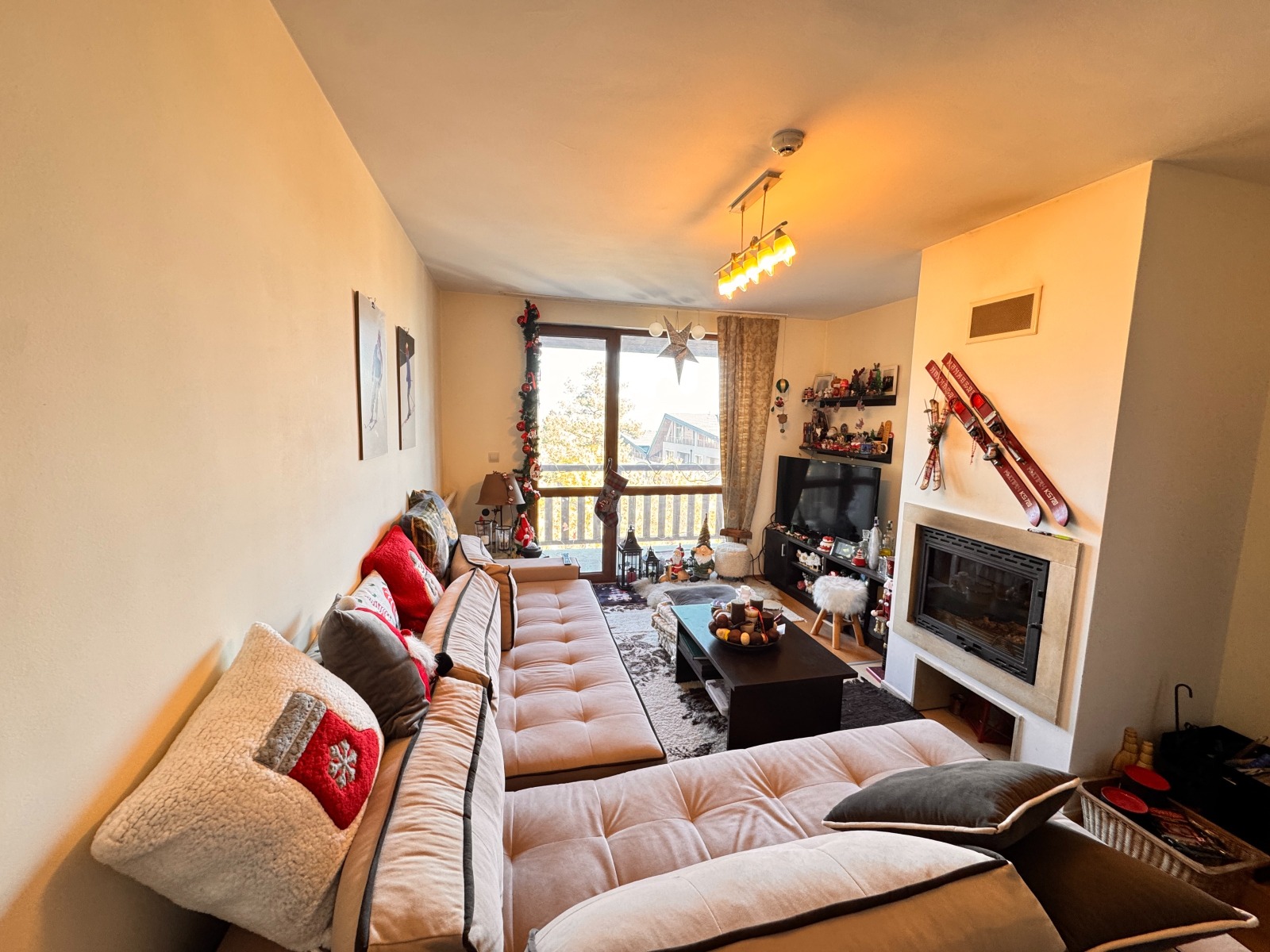 Хол с разтегателен диван, масичка за кафе, телевизор, камина