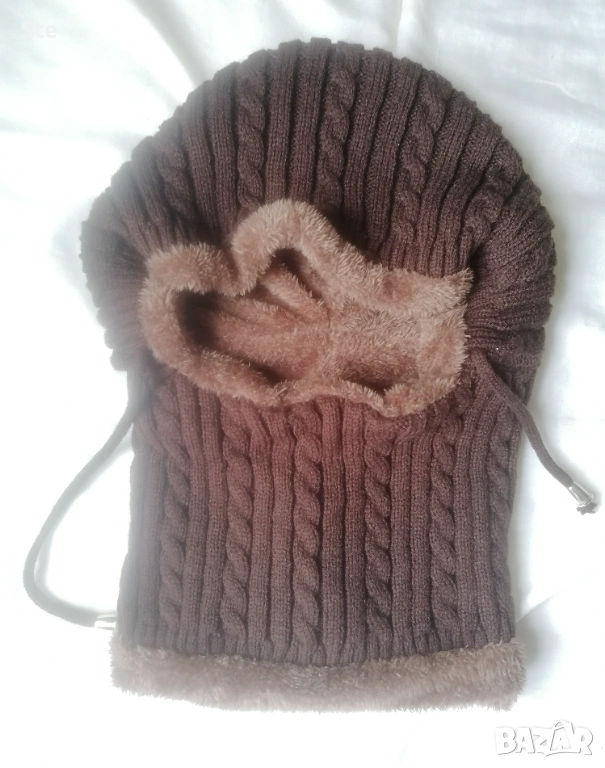 Нов плетен, кафяф шапка-шал за зимата в един продукт. Ново, не използвано. Подходящо за деца 5-8г