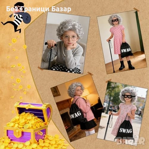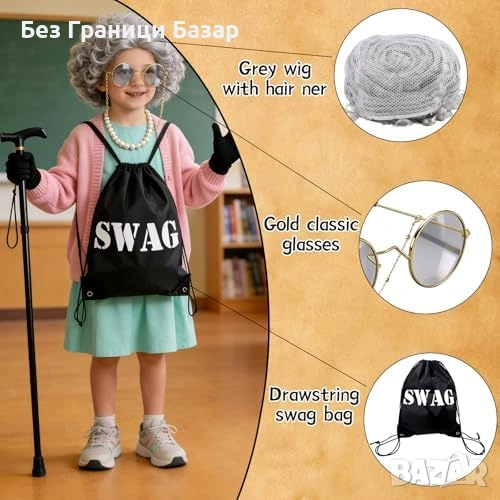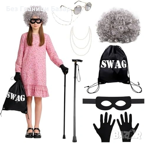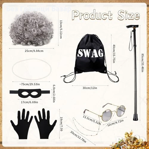 7 аксесоара в един сет: къдрава сива перука с мрежичка, маска за очи „обирджия“, винтидж очила с верижка, многослойно изкуствено перлено колие, черни ръкавици, телескопичен бастун, връзваща се торбичка с надпис SWAG