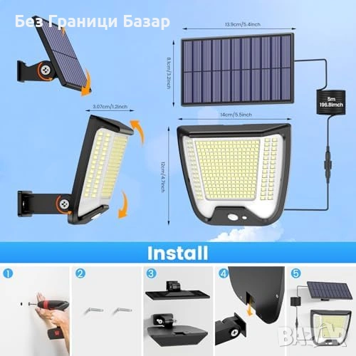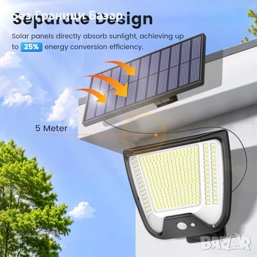 Нова Соларна охранителна лампа 288 LED 3 режима PIR IP65 отделен панел