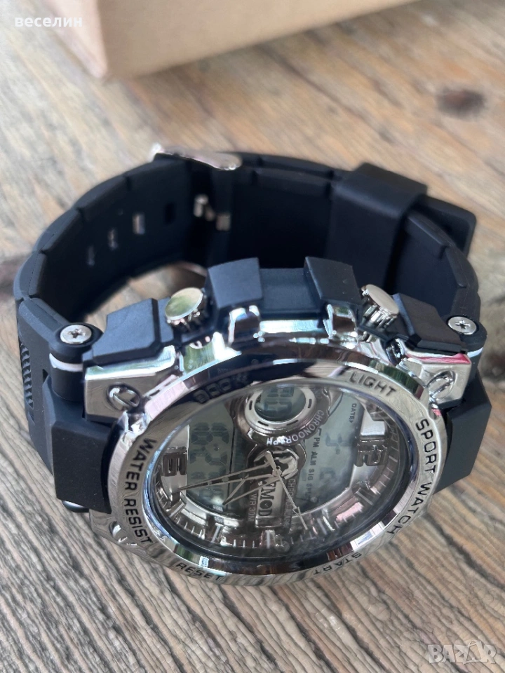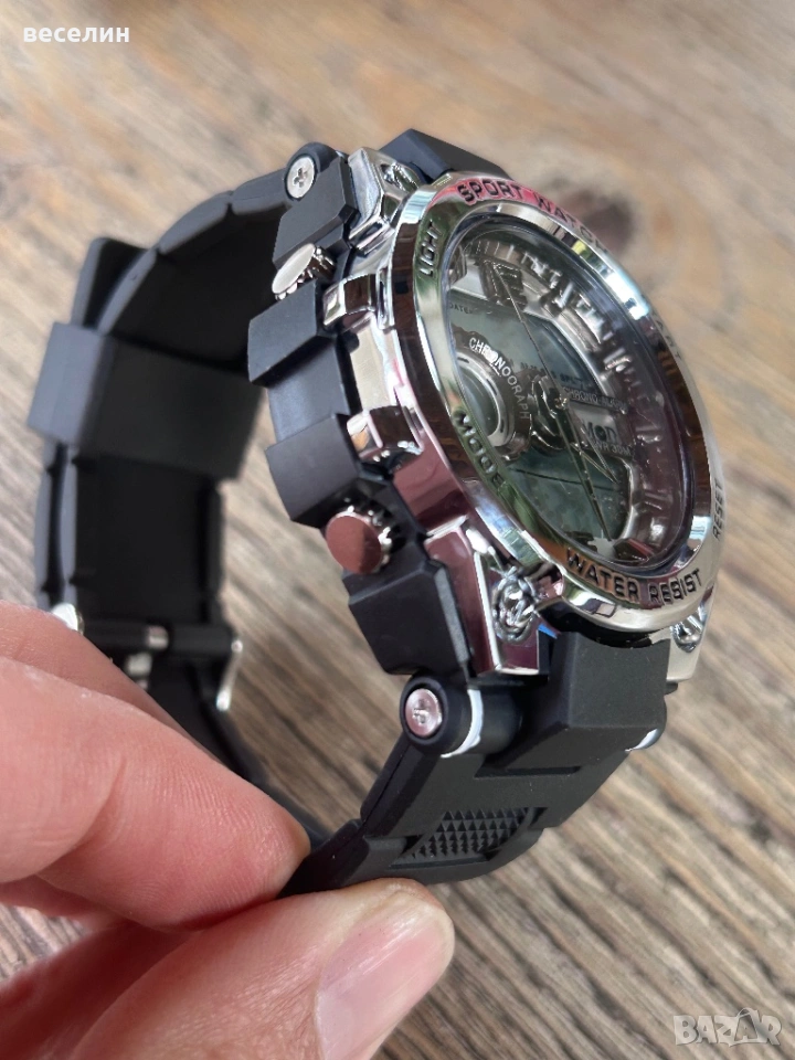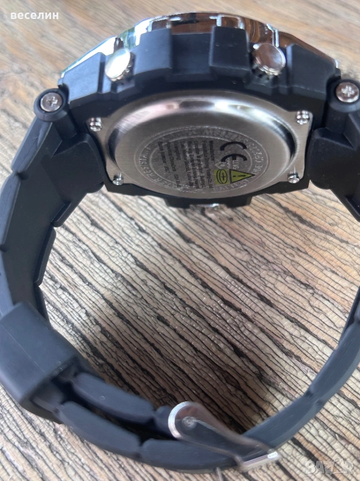 Страхотен спортен часовник направен от метал и полимер. Силиконова каишка. Аналоговата част се сверява от коронката, дигиталния дисплей от копчетата ( има упътване на английски). По функции наподобява часовниците Casio - има хронометър, аларма, звук на кръгъл час, подсветка на електронния дисплей и др. Чисто нов, никога не е носен. Подходящ за подарък.
