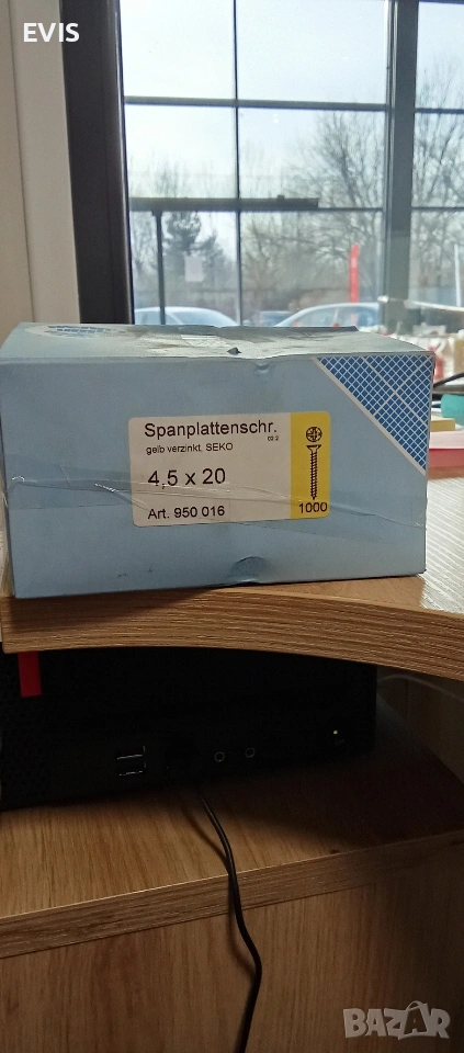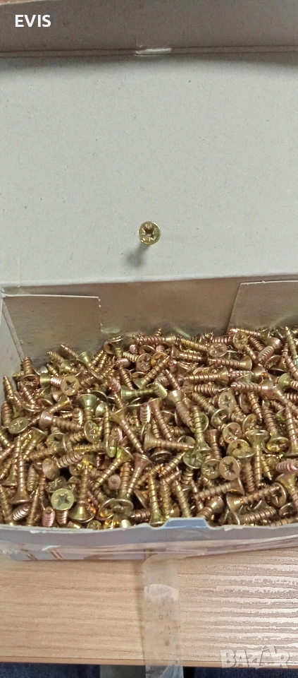 Заглавие: Винтове за ПДЧ 4.5 x 20 мм (1000 бр.) – Жълто поцинковани Описание: Продавам пълен пакет висококачествени винтове за ПДЧ (Spanplattenschrauben). Винтовете са с конусна глава (SEKO) и са идеални за мебелно производство, дърводелски услуги или домашни ремонти. Характеристики: Размер: 4.5 x 20 мм Тип глава: Потайни (SEKO) с кръстат прорез (Pozidriv) Покритие: Жълто поцинковани (gelb verzinkt) – осигурява добра корозионна устойчивост. Количество в кутия: 1000 броя. Състояние: Ново, неразопаковано. Доставка: Изпращам с опция преглед и тест чрез: Еконт (с отстъпка от цената на доставката) Спиди