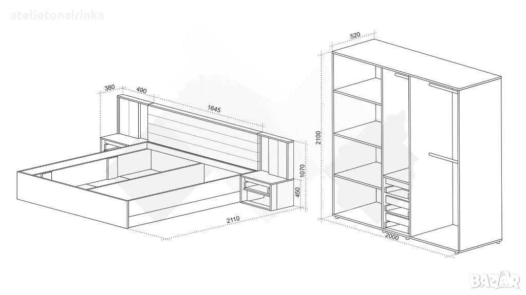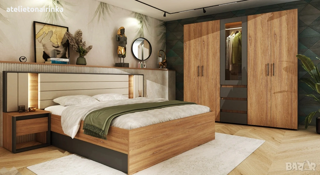 Спалня с тапицирана табла с бежова дамаска, вградено LED осветление с дистанционно управление и повдигащ амортисьорен механизъм, за матрак 160/ 200 см.
