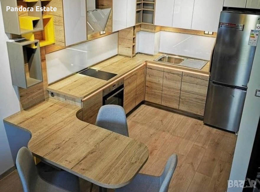 кухненски бокс и трапезария, две спални , баня с тоалетна, мокро помещение ,