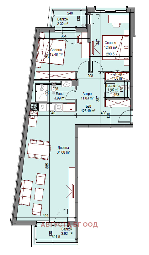 АПАРТАМЕНТЪТ има следното разпределение: дневна с трапезария и кухненски бокс - 32 м2; две спални - 13,5 и 13 м2; баня - 4 м2, тоалетна - 2 м2, антре с място за вграден гардероб - 11,8 м2; 2 балкона - 4 и 3,3 м2; Изложение: Ю/С;