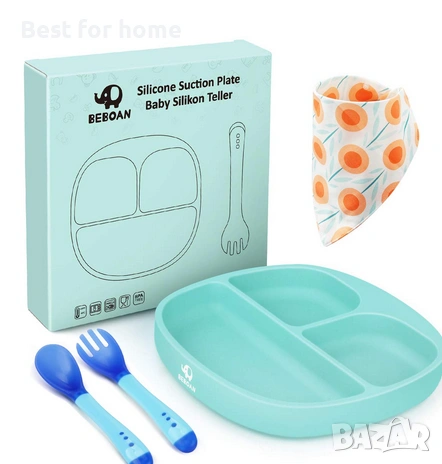 BEBOAN Силиконова разделена чиния, подобрени неплъзгащи се вакуумни плочи, 100% без BPA чинийки за хранене, чиния за бебета, подходяща за повечето столчета за хранене (светлозелено): Отзив за бебето: Страхотно качество - Страхотно качество. Има голяма вендуза, която затруднява повдигането на нашето мъниче от масата. Предлага се с ергономична лъжица и вилица. Отзив: Страхотен продукт - Закрепва се много лесно към плот, маса или столче за хранене. Достатъчно голям за различни храни