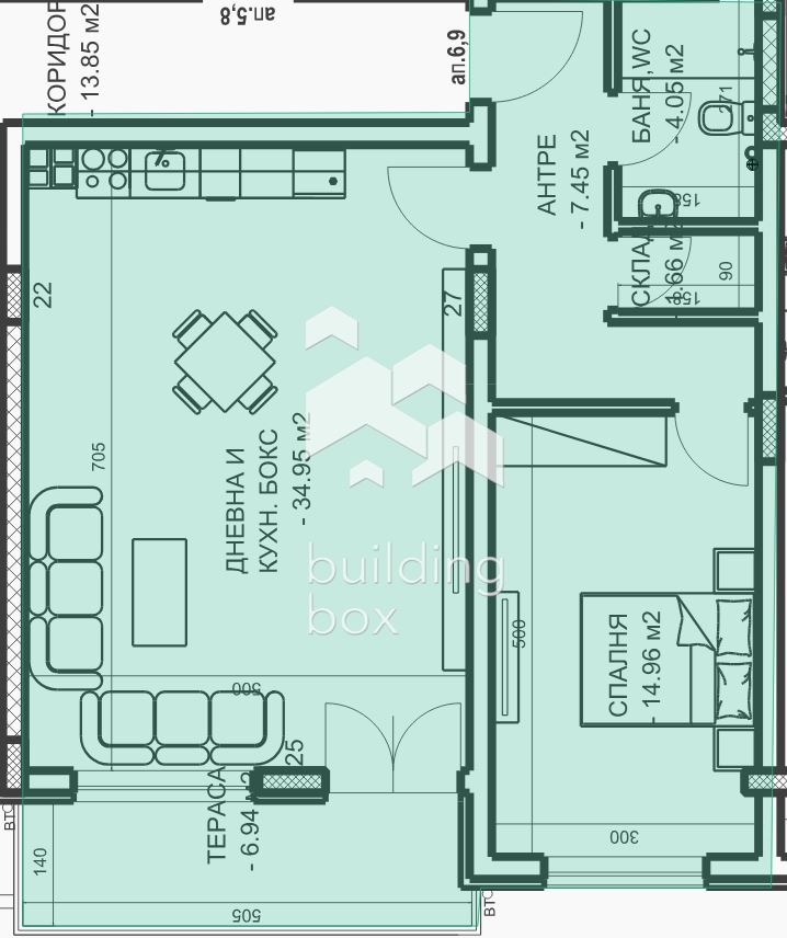РАЗПРЕДЕЛЕНИЕ: Всекидневна с кухненски бокс с площ 34,95 кв. м, спалня с площ 14,96 кв. м, втора спалня с площ 16,92 кв. м, антре, баня с тоалетна и тераса.
