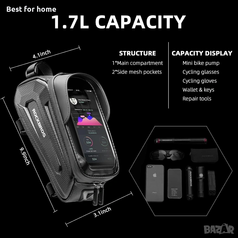 ГОЛЯМО ПРОСТРАНСТВО ЗА СЪХРАНЕНИЕ: Побира много неща като мобилен телефон, портфейл, кредитни карти, ключове, енергиен бар, слънчеви очила, инструменти за ремонт или други велосипедни принадлежности. Два мрежести джоба от двете страни на чантата за телефон правят вашите вещи сухи. Може да се съхранява отделно и да се поддържа подредено.