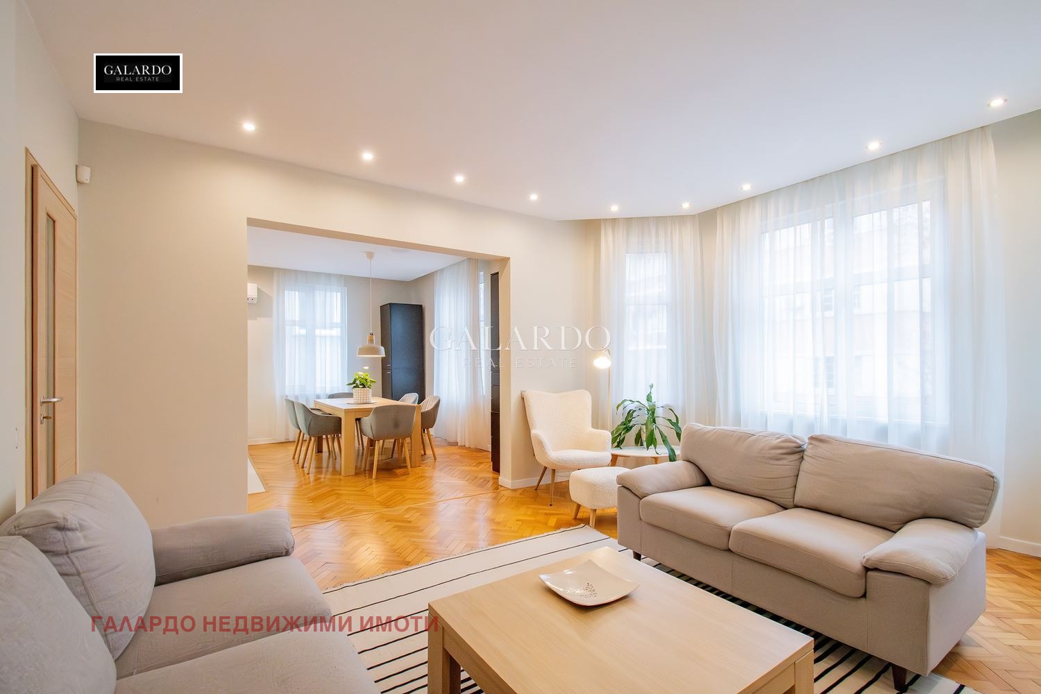 Апартаментът впечатлява с просторни помещения с елегантен интериор, високи тавани и изобилие от естествена светлина.