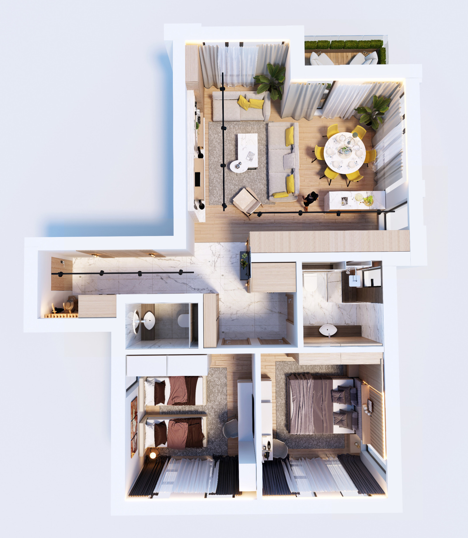Апартамента се състои от просторен дневен тракт с изглед към Варненския залив, 2 бани-тоалет, 2 спални, килер, перално, тераса.