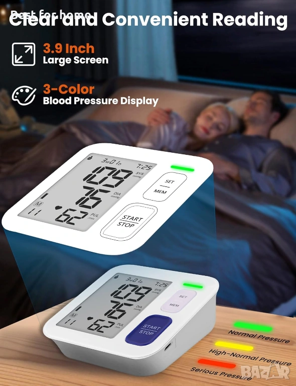 4" LCD: Ясни цифри за систолично/диастолично/пулсово налягане - видими от другата страна на масата.