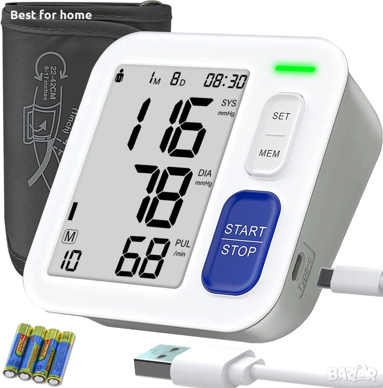 Въпрос: За какъв размер ръка е подходящ маншетът? О: Обиколка на горната част на ръката 9–17 инча (22–42 см). В: Колко точен е мониторът? О: Точност на налягането ±3 mmHg; пулс ±5% в диапазони 0–299 mmHg и 40–199 удара в минута. В: Могат ли двама души да измерват пулса отделно? О: Да. 2 потребители × 90 показания всеки с превключвател с едно докосване. В: С батерии или с включен в контакт? О: И двете. Използвайте включените батерии или USB-C захранване.