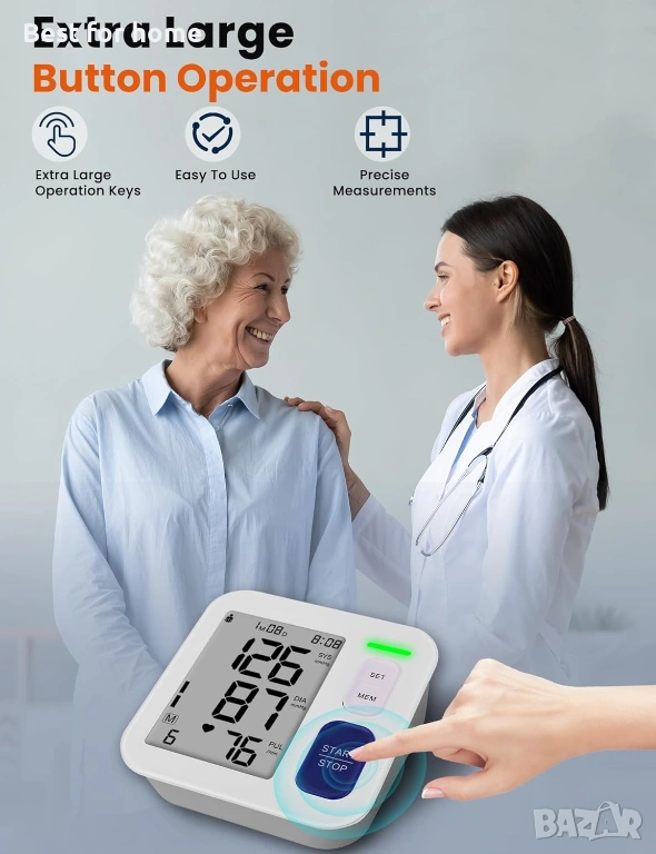 Един голям бутон: Апаратът за кръвно налягане е лесен за стартиране с едно докосване, подходящ за всеки.