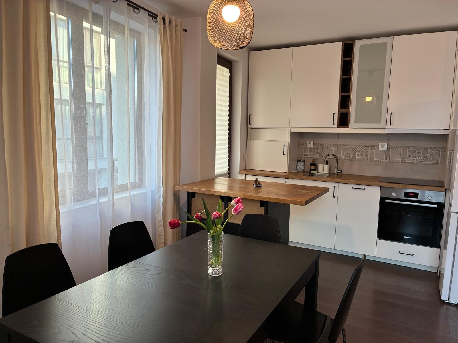 - обширна дневна с трапезария и кухненски бокс и тераса, висок клас уреди и миялна