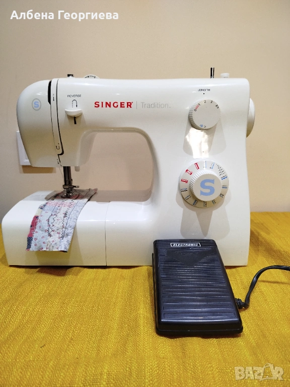 Шевна машина SINGER TRADITION с 23 програми: основни, декоративни и за еластични материи комплект с педал и материали към нея в много добро състояние .