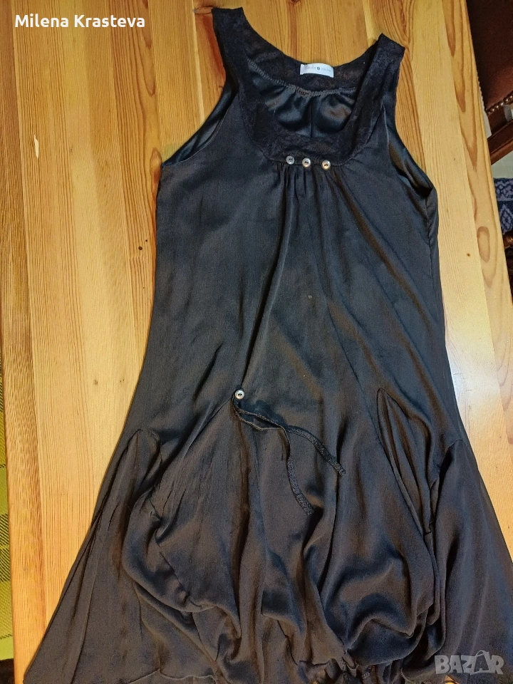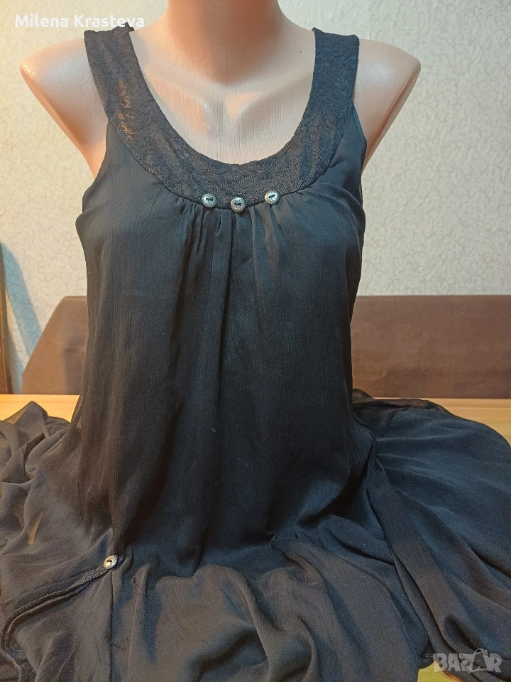 Малка черна рокля. Дантели. Метални копчета за декорация. Интересен разскрой. В долният си край роклята е на набори за ефирност.