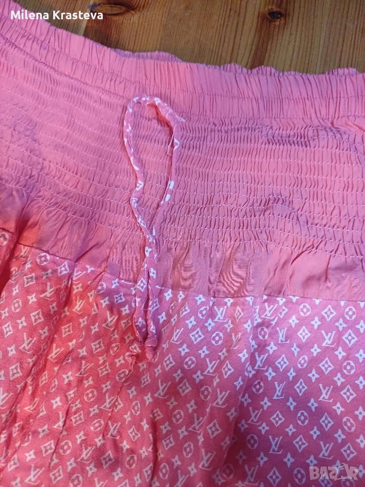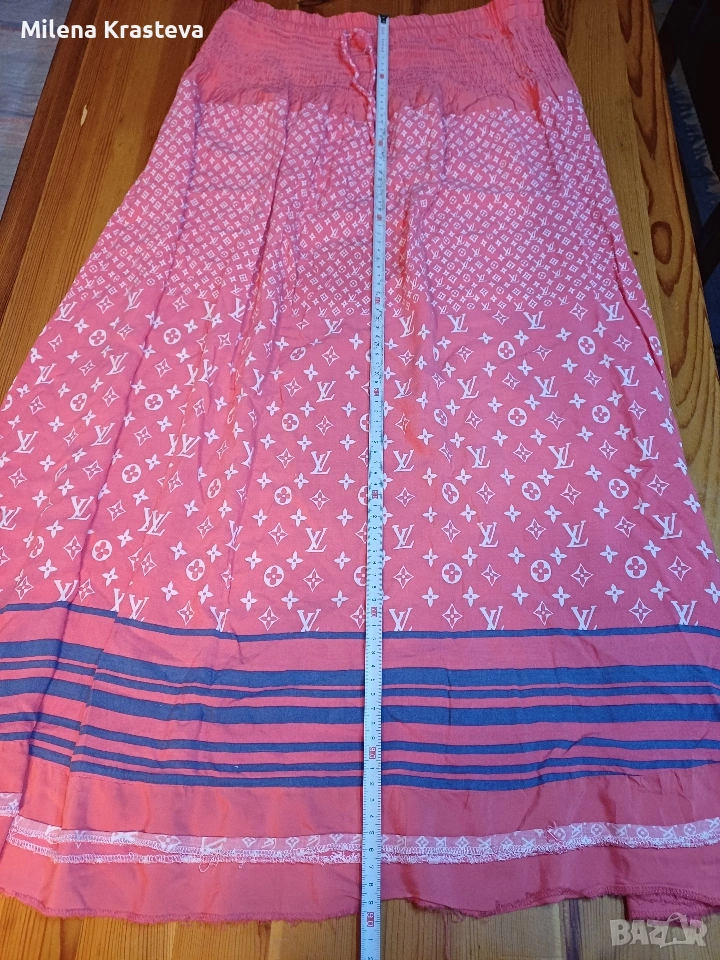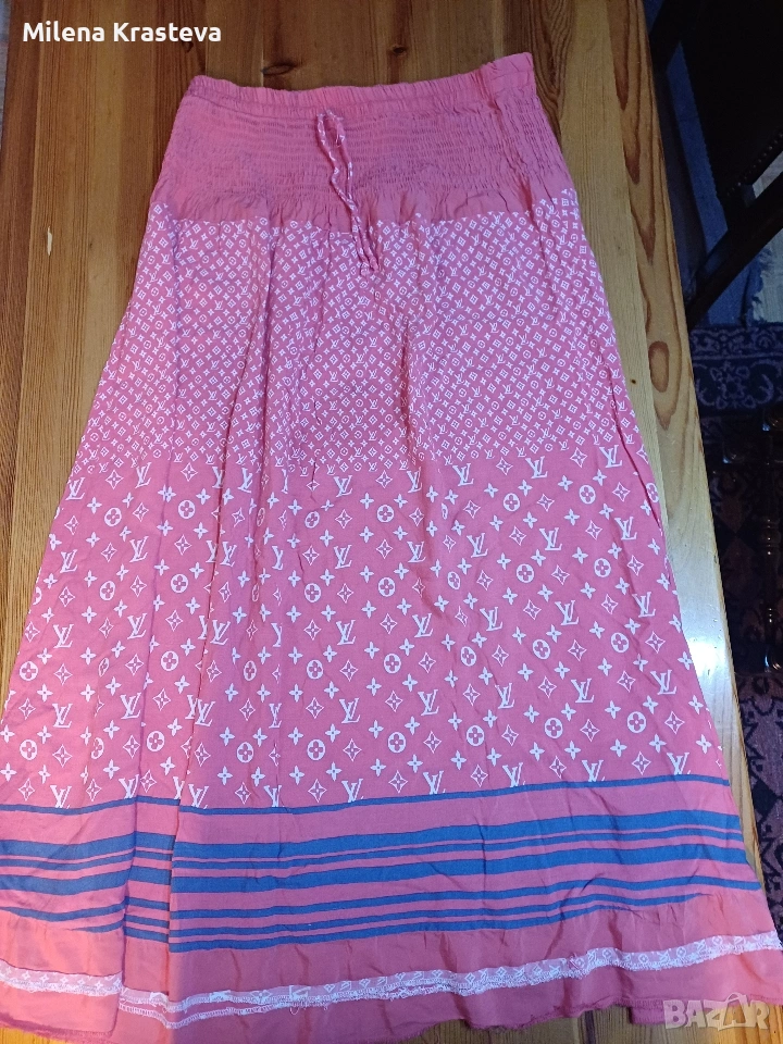 Дълга пола. В горният си край е ластична. Разтяга се до 106 см. Свежа щампа.