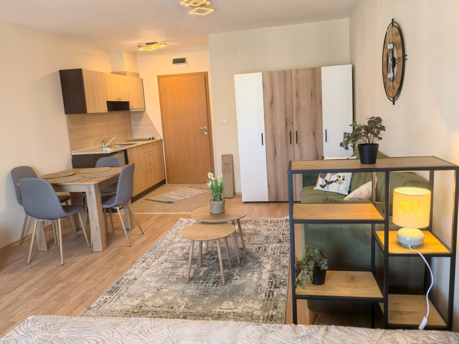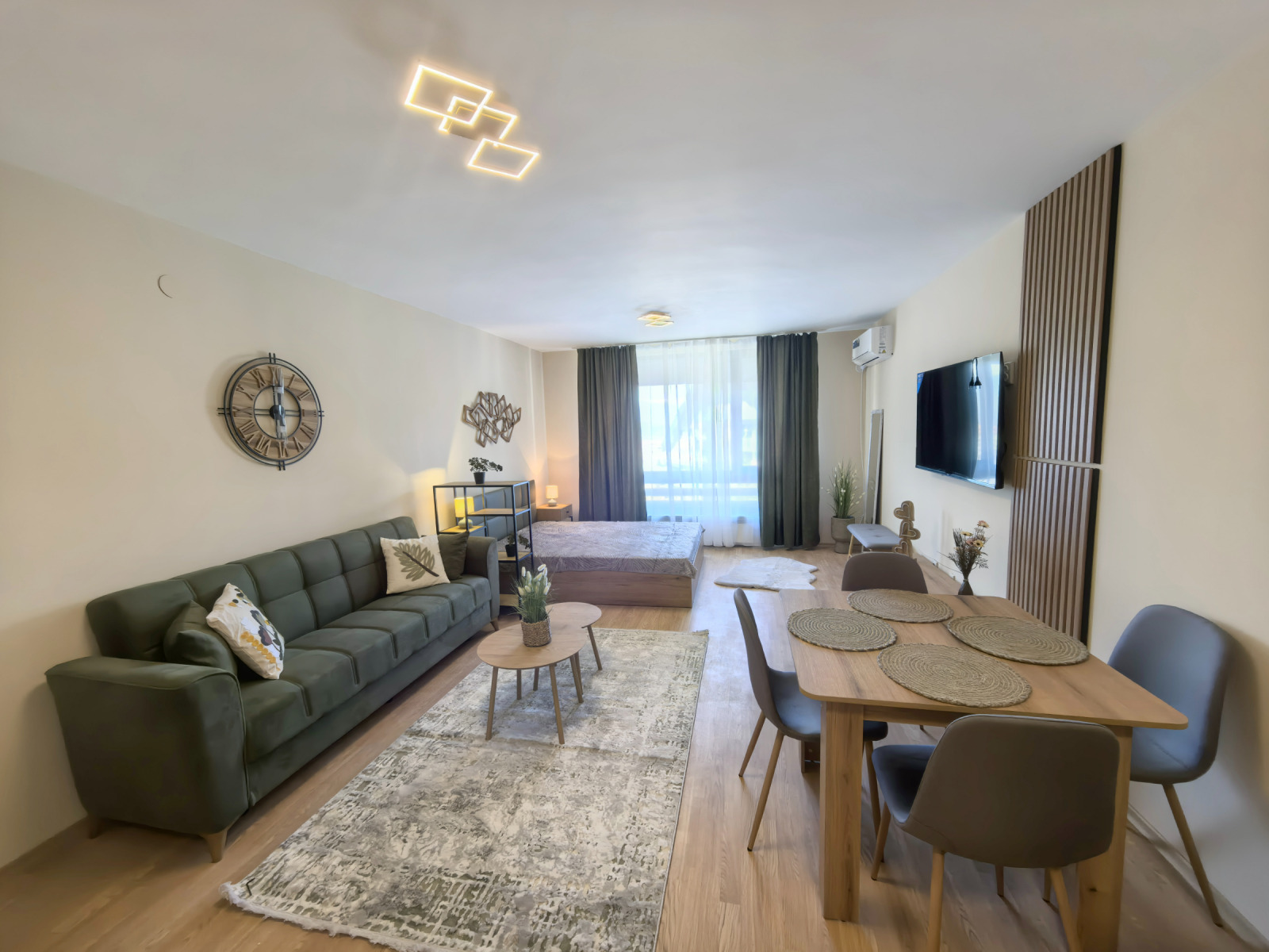 Апартаментът е НАПЪЛНО ОБЗАВЕДЕН С ЧИСТО НОВИ МЕБЕЛИ И УРЕДИ, с вкус към най-малкият детайл и чака с нетърпение своите нови собственици!