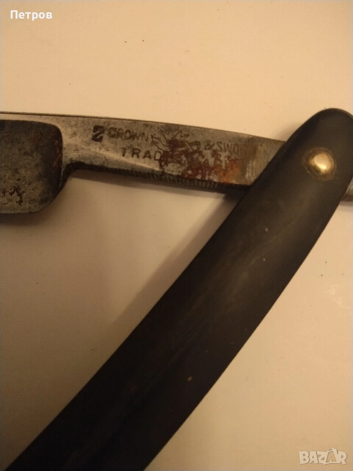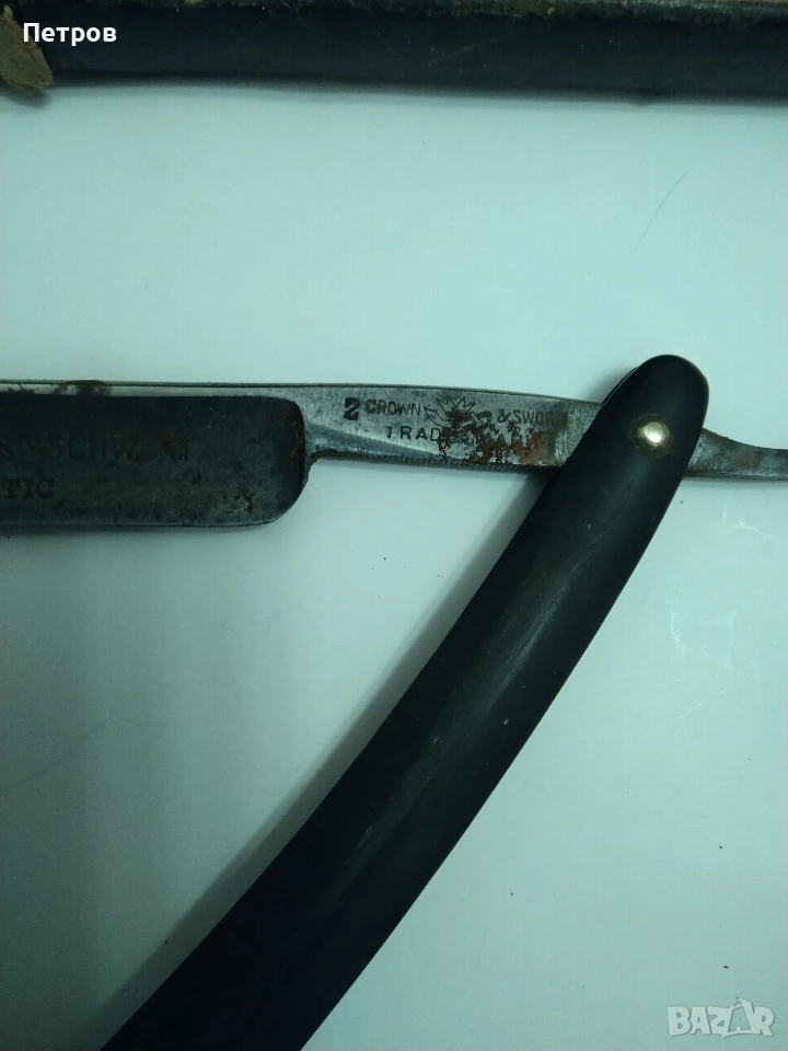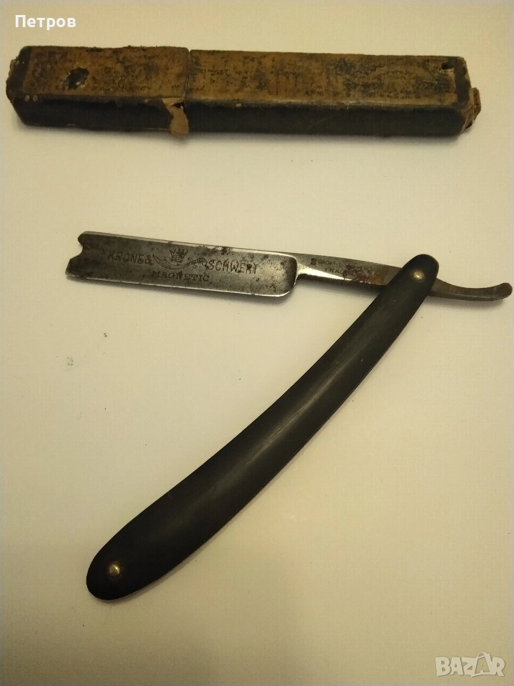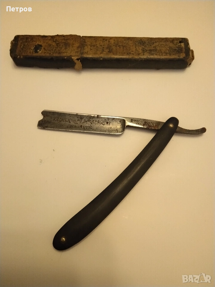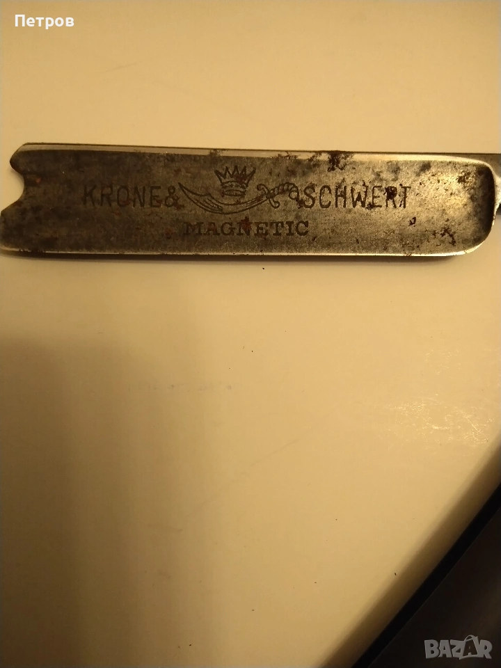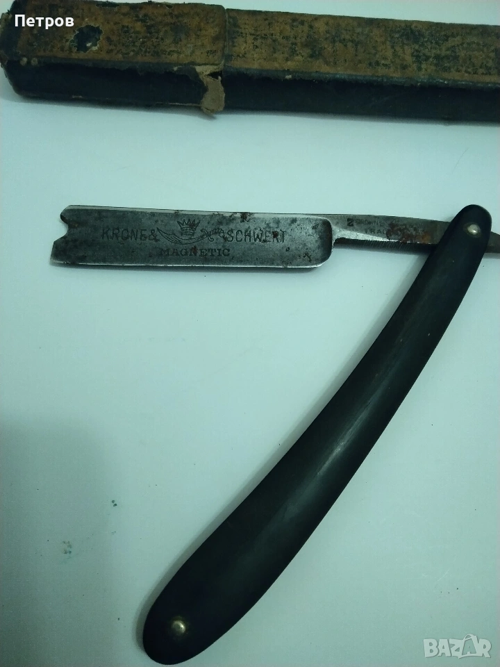 бръснач от известната марка Krone & Schwert (Корона и меч), произведен в Солинген, Германия. Марката Krone & Schwert е известна с висококачествените си бръснарски инструменти. Надписът "Magnetic" на острието често е използван като маркетинг инструмент в миналото, за да подскаже за здравината или вида на стоманата, а не че е буквално магнитен. Такива предмети се считат за колекционерски ценности. Характеристики и детайли на бръснача Марка: Krone & Schwert (немски за „Корона и меч“). Марката е свързана с известния производител Carl Friedrich Ern от Солинген. Модел: На острието е гравиран надписът "MAGNETIC", което показва специфичната серия или обработка на стоманата. Произход: Тези бръсначи са произведени от компанията на Carl Friedrich Ern в град Солинген, известен с производството на висококачествени режещи инструменти, често наричан „Градът на остриетата“. Символика: Логото изобразява корона, поставена върху извит меч (сабя), което съответства на името на марката. Дизайн: Острието има характерна вдлъбнатина в края, известна като "Barber's Notch", която улеснява изваждането му от дръжката. Състояние и стойност Състояние: Продаваният екземпляр е в автентично състояние със следи от времето (патина и лека корозия). Неизползван. Колекционерска стойност: бръснача има антикварна стойност и е предназначен за колекционери на антикварни предмети. Цена 60 € Продавам това което е снимано на приложените снимки