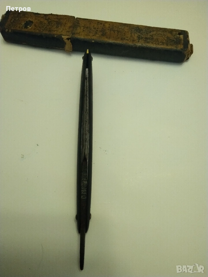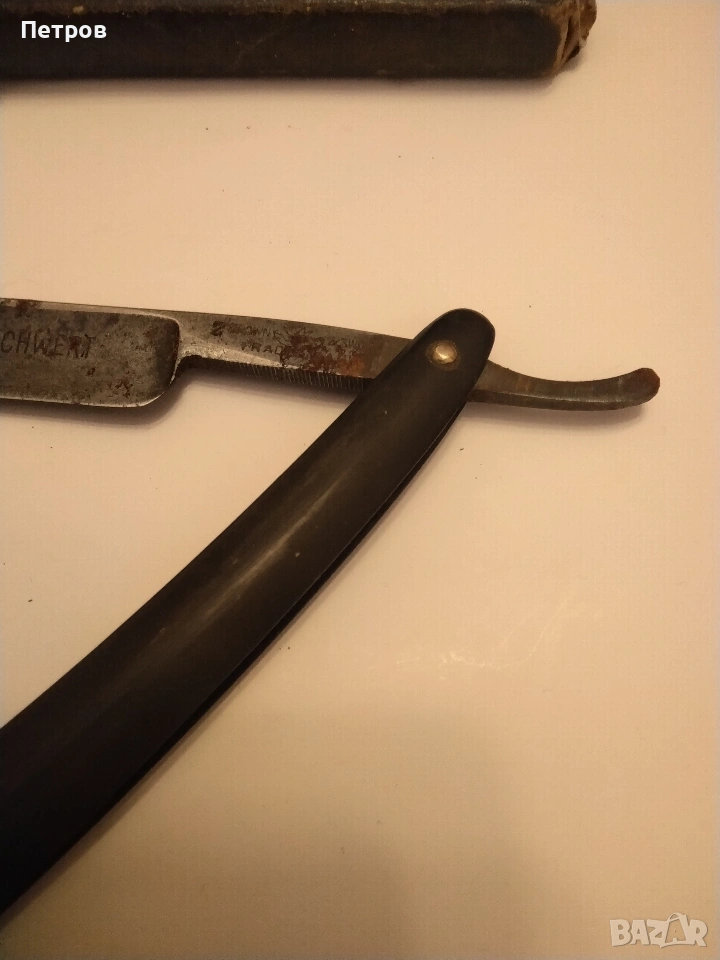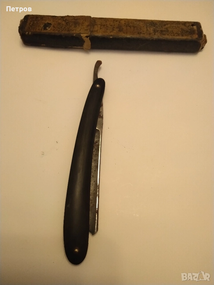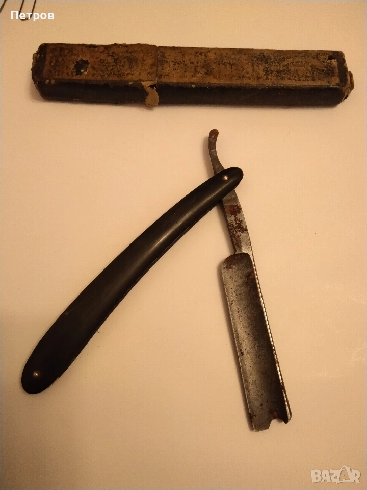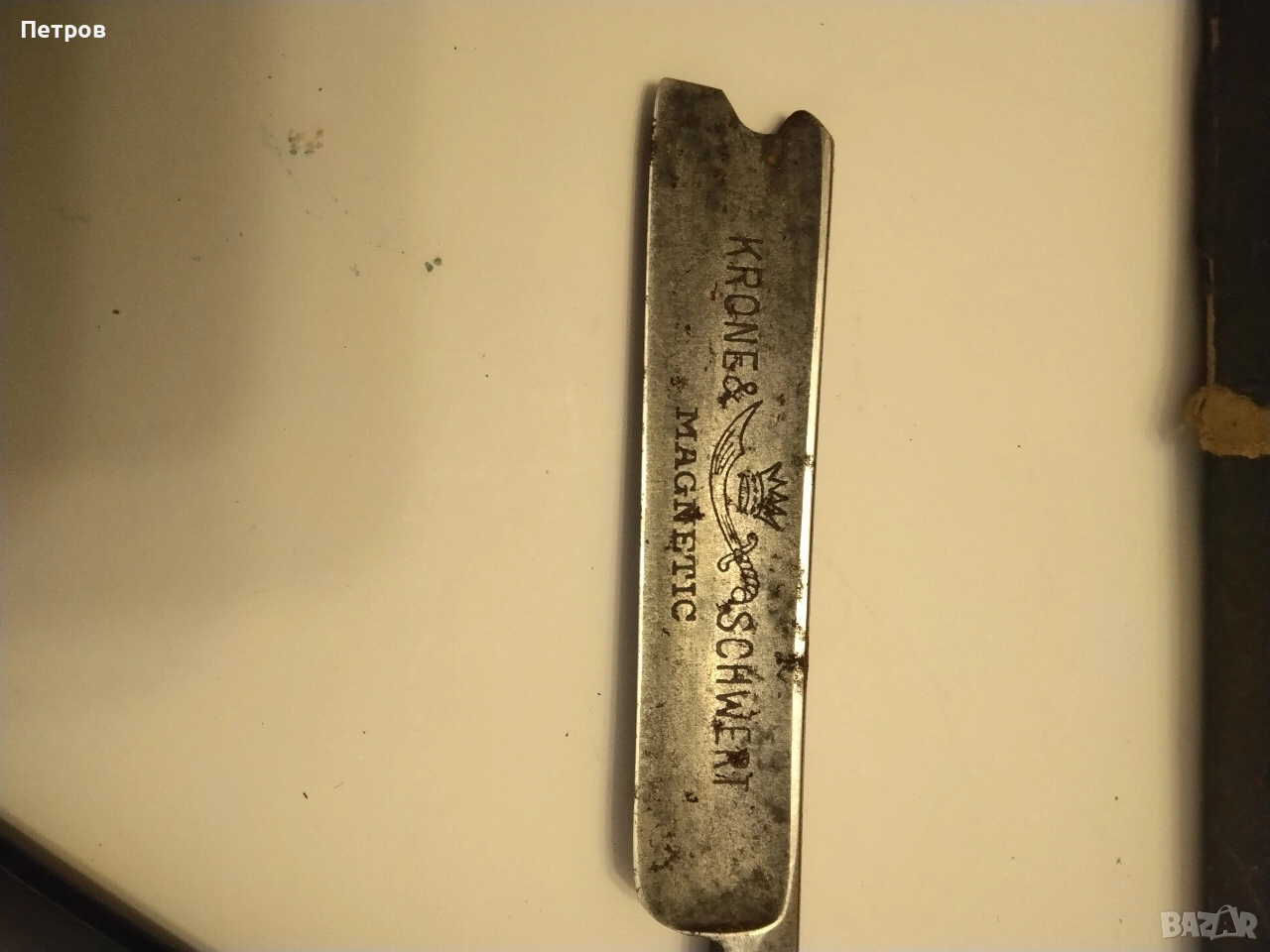 бръснач от известната марка Krone & Schwert (Корона и меч), произведен в Солинген, Германия. Марката Krone & Schwert е известна с висококачествените си бръснарски инструменти. Надписът "Magnetic" на острието често е използван като маркетинг инструмент в миналото, за да подскаже за здравината или вида на стоманата, а не че е буквално магнитен. Такива предмети се считат за колекционерски ценности. Характеристики и детайли на бръснача Марка: Krone & Schwert (немски за „Корона и меч“). Марката е свързана с известния производител Carl Friedrich Ern от Солинген. Модел: На острието е гравиран надписът "MAGNETIC", което показва специфичната серия или обработка на стоманата. Произход: Тези бръсначи са произведени от компанията на Carl Friedrich Ern в град Солинген, известен с производството на висококачествени режещи инструменти, често наричан „Градът на остриетата“. Символика: Логото изобразява корона, поставена върху извит меч (сабя), което съответства на името на марката. Дизайн: Острието има характерна вдлъбнатина в края, известна като "Barber's Notch", която улеснява изваждането му от дръжката. Състояние и стойност Състояние: Продаваният екземпляр е в автентично състояние със следи от времето (патина и лека корозия). Неизползван. Колекционерска стойност: бръснача има антикварна стойност и е предназначен за колекционери на антикварни предмети. Цена 60 € Продавам това което е снимано на приложените снимки