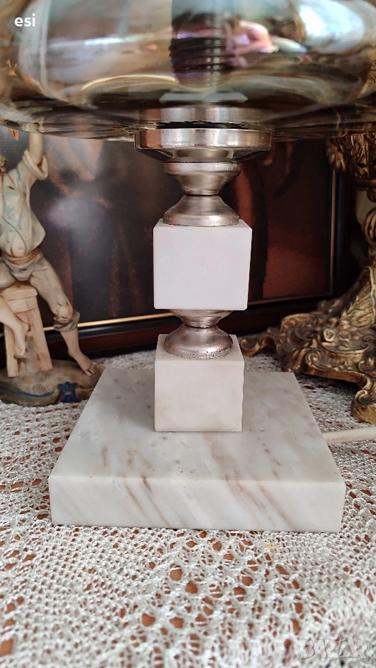 Винтидж настолна лампа с мраморна основа и стъклен абажур Лампата съчетава геометрични мраморни елементи с метални акценти и стъклен абажур Височина 31 см Цена 37 € / 72,37 лв