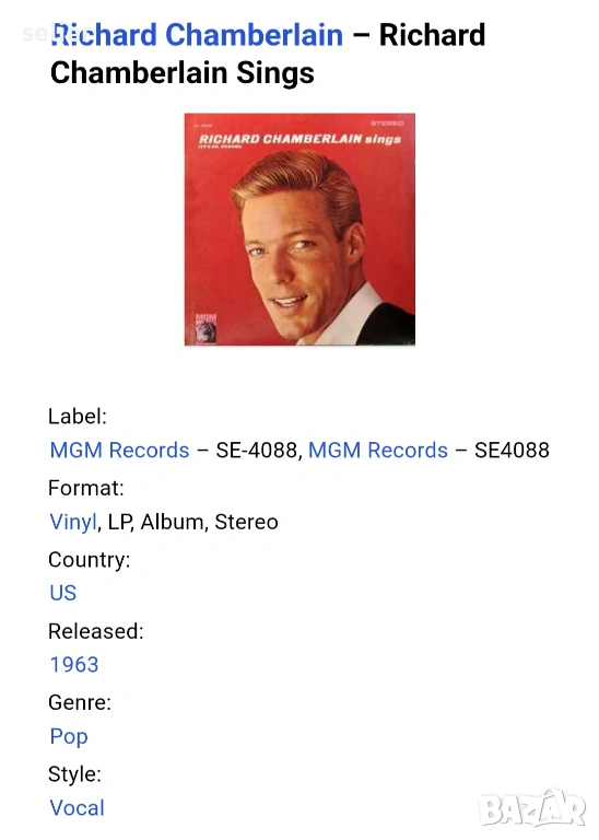 Richard Chamberlain ‎– Richard Chamberlain Sings Издание 🇺🇸 USA 1963г-Първа преса Състояние на ви → Обява 53686216