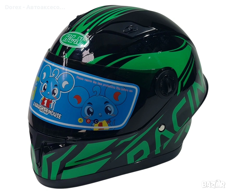 Това е детска мото/скутер каска с цяла лицева защита (Full Face), предназначена за максимална безопасност на детето при каране.