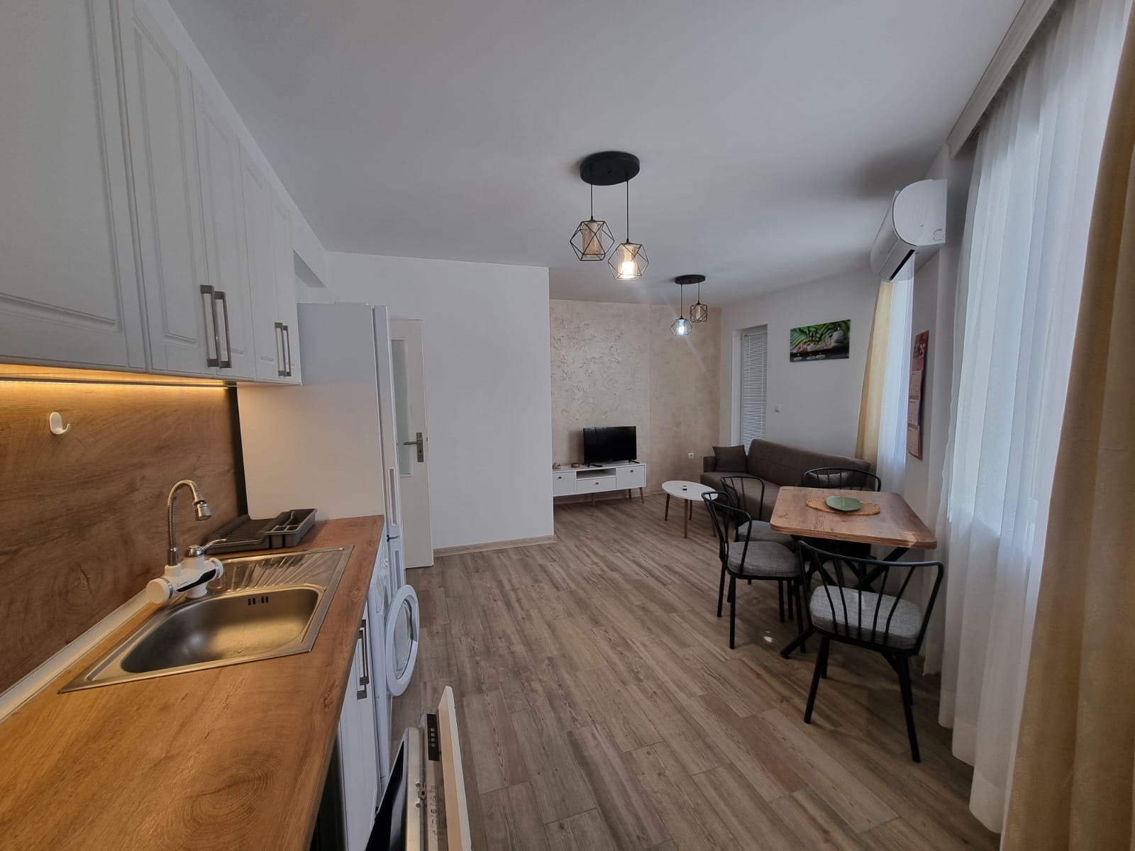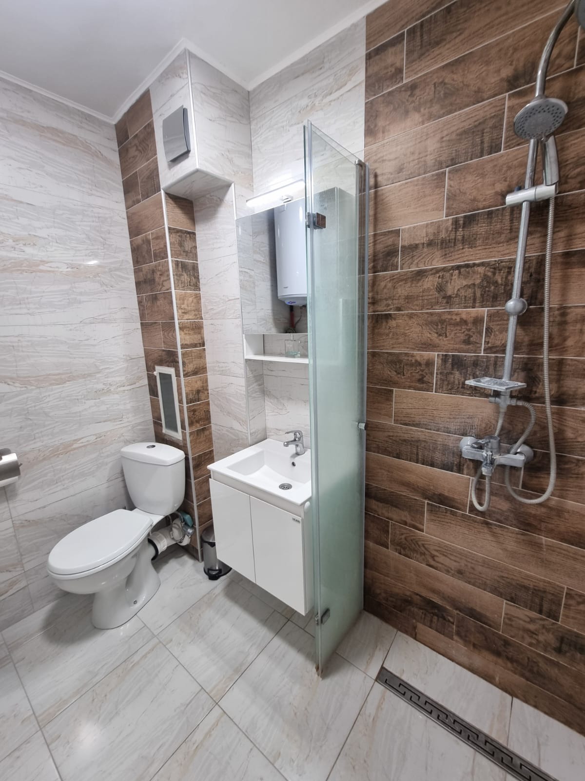 Имотът е ситуиран на 1 жилищен етаж с югозападно изложение. Състои се от входно антре, дневна с кухненски бокс, две спални, гардероб, баня с тоалетна, две тераси.