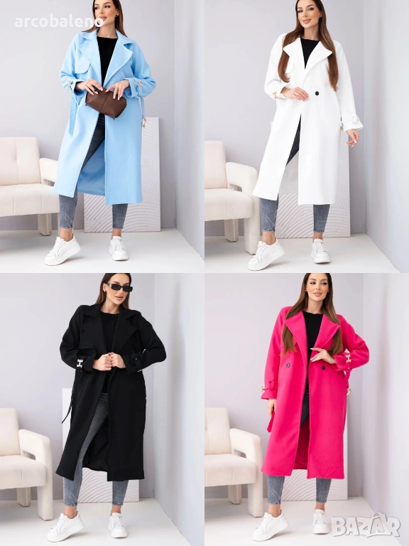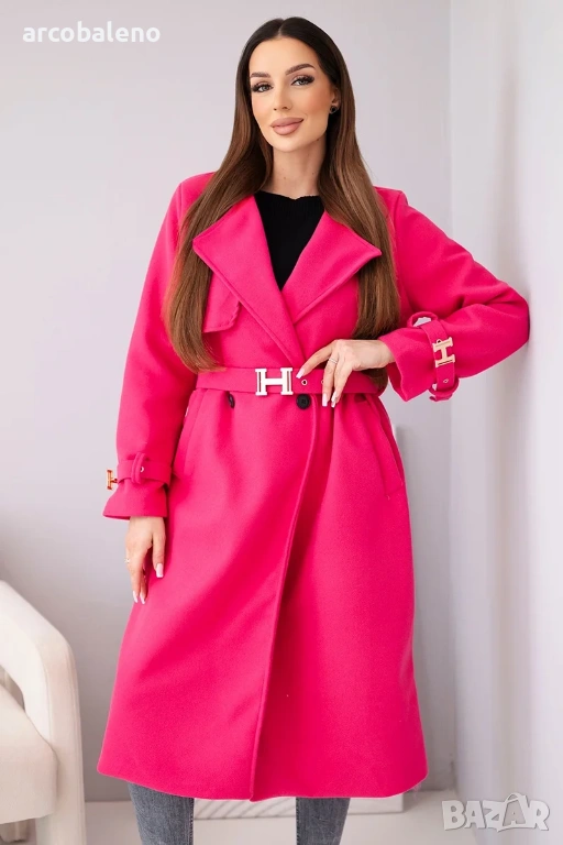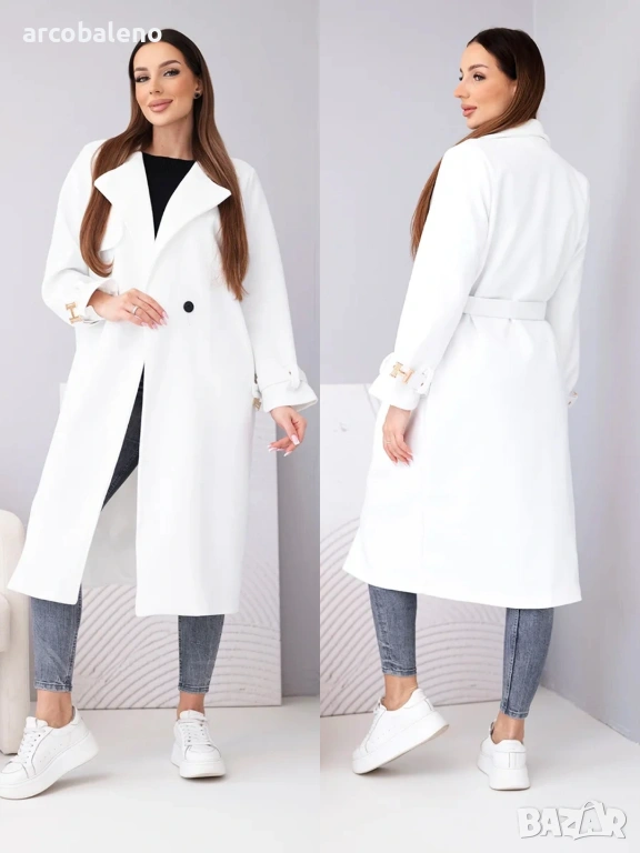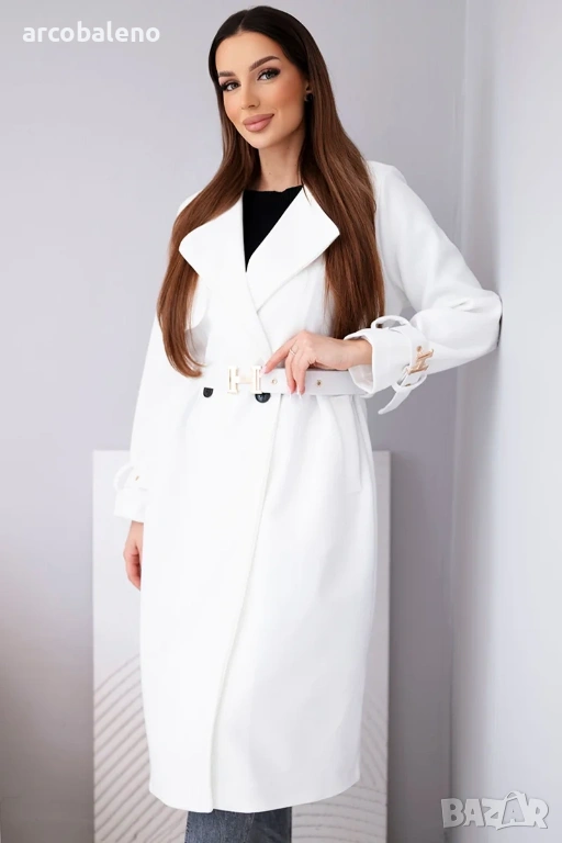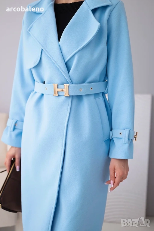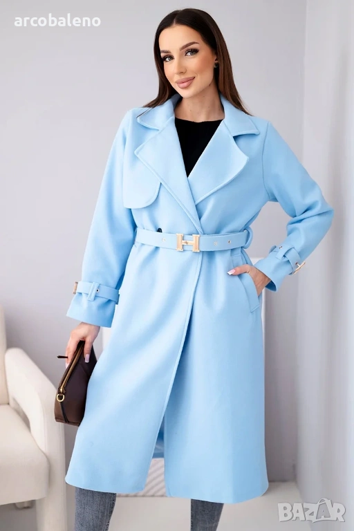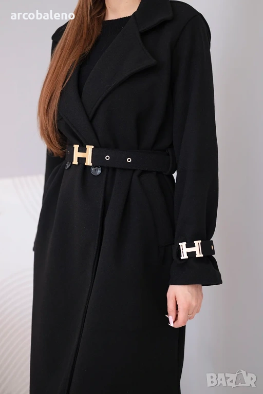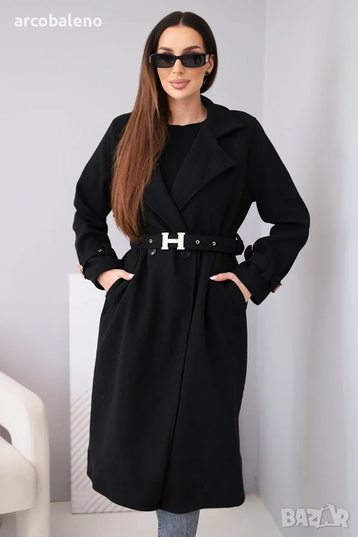 дамско палто с колан е изключителен избор за жени, които ценят стила и вечния класически дизайн. Моделът с дължина midi красиво подчертава силуета, а включеният колан с декоративна златна катарама придава на дрехата луксозен характер.