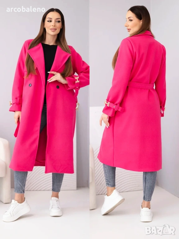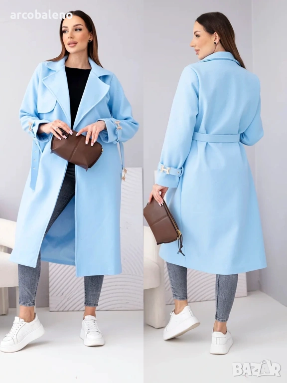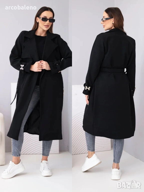 Палтото е с класическа яка и ефектни завършващи ръкави с декоративни катарами, които привличат вниманието и подчертават елегантния стил. Материята е мека, приятна на допир и леко еластична, което осигурява комфортно носене. Идеално за ежедневието, бизнеса и специалните поводи.