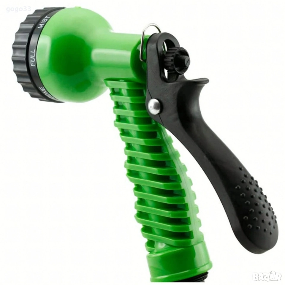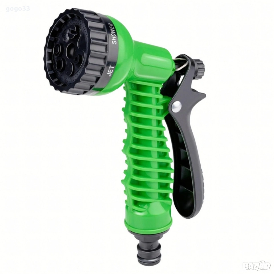 Мултифункционален градински пистолет за поливане – 6 режима на работа, ергономичен дизайн Цена: 10 евро Тип: Пистолет / Градински пистолет за поливане/пръскане Брой режими: 6 Регулиране на потока: Да Заключване на спусъка: Да (метална кука) Цвят: Зелен Размери: Височина 19 см, Ширина 16 см Връзка: Стандартна, подходяща за бързи конектори Материал: Издръжлива пластмаса, устойчива на атмосферни влияния Приложения: поливане на трева, цветя, зеленчуци; миене на автомобили; почистване на тераси; къпане на животни