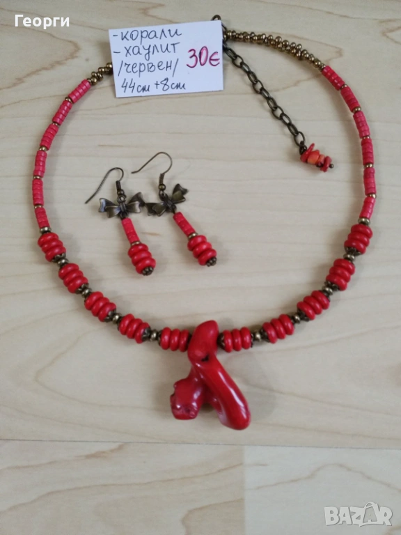 Стилно дамско колие с червен корал и хаулит в наситен топъл цвят, завършено с впечатляваща централна висулка корал и елегантни обеци. Ръчно изработено бижу, което привлича погледа и придава характер на всяка визия.