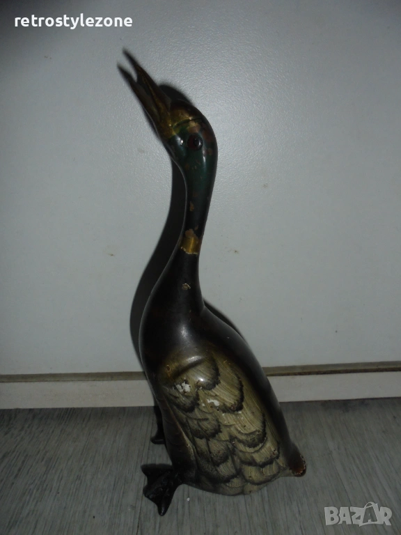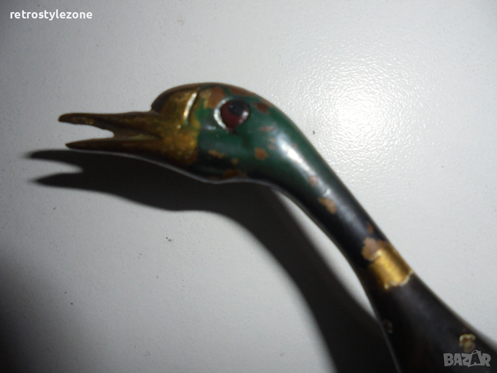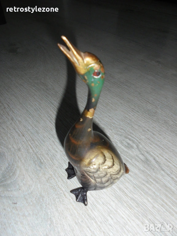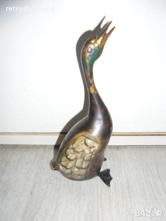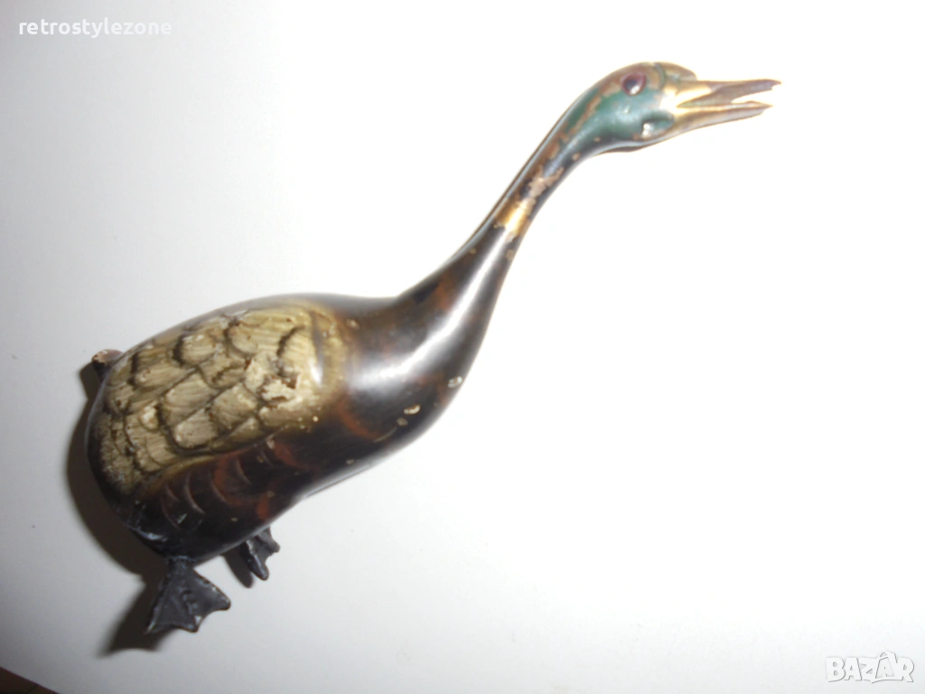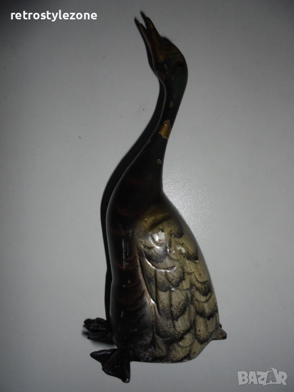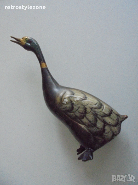 Стилна и изразителна стара метална фигурка на патица, изработена от бронз с красива естествена патина и артистично изпълнение. Подходяща за колекционери, любители на винтидж интериора, ретро декора или тематични композиции.