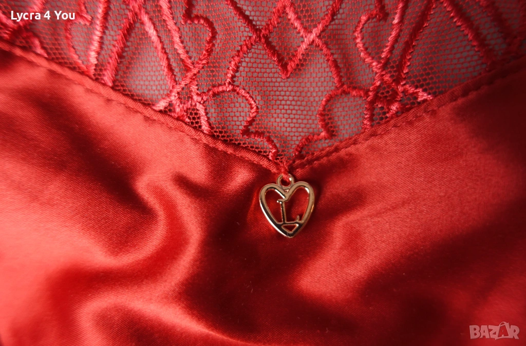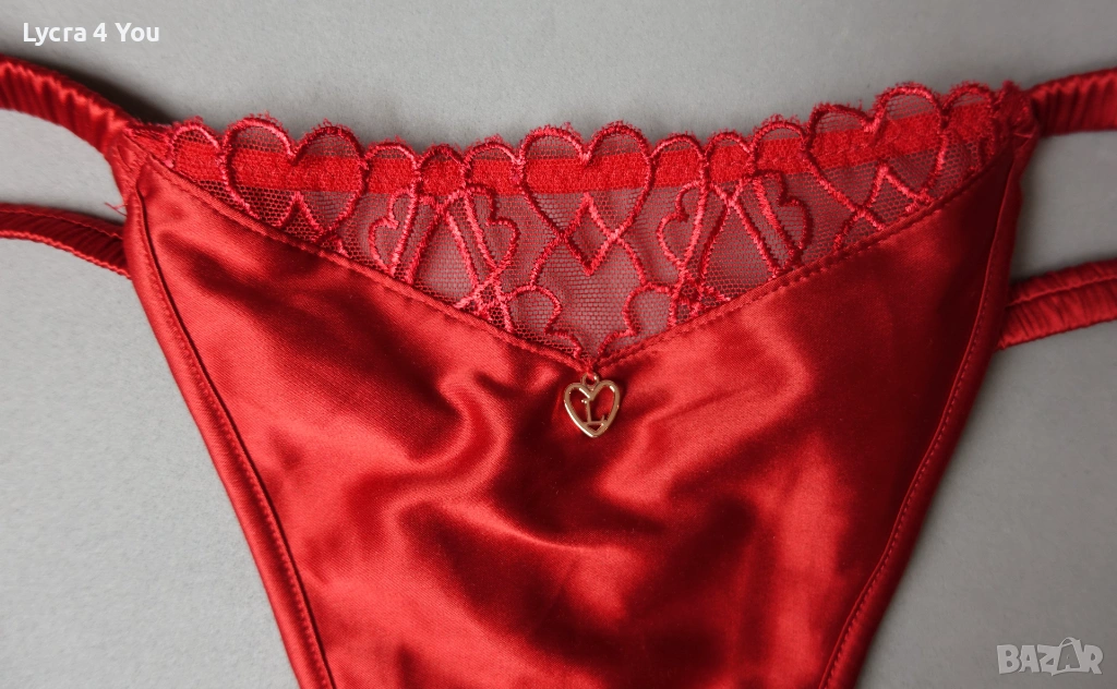 Луксозни червени прашки от сатен с златисти метални елементи и сърце с буквичка L отпред.