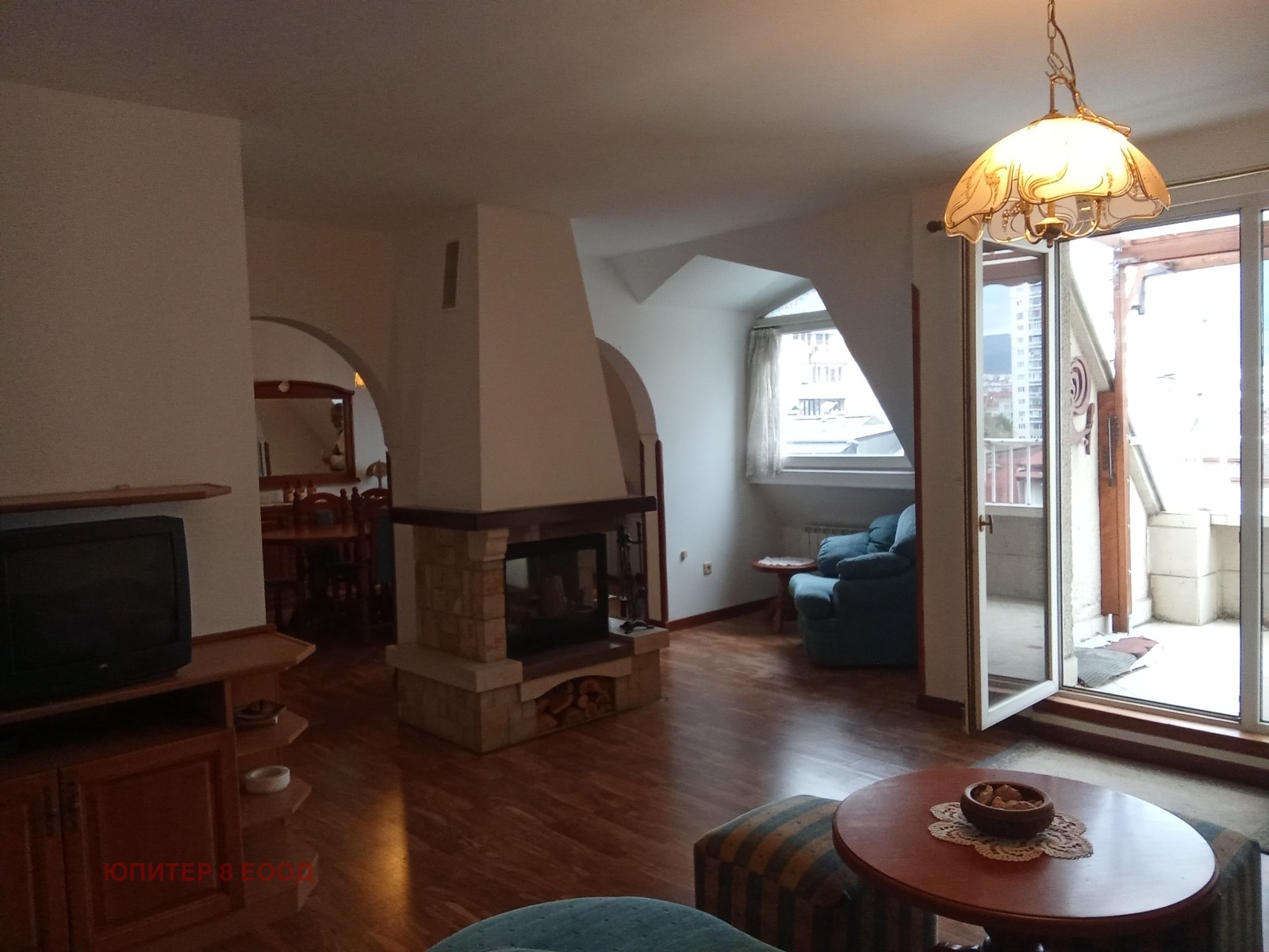 Апартаментът е след ремонт и е със следното разпределение: коридор, просторна дневна с камина, отворена към светла трапезария и светла кухня. Тераса с панорама към Витоша пред хола. Самостоятелен вход за кухнята от коридора, две самостоятелни спални, към една от които има дрешник. Голяма баня с тоалетна, ТЕЦ и самостоятелно ел. котле към апартамента. Артистични скосявания в трапезарията. Изложение: североизток /спални/, югозапад /хол, трапезария, кухня, тераса. Подова настилка : естествен паркет, баня с тоалетна: теракот, фаянс, вана. Апартаментът е напълно обзаведен с мебели от масив.