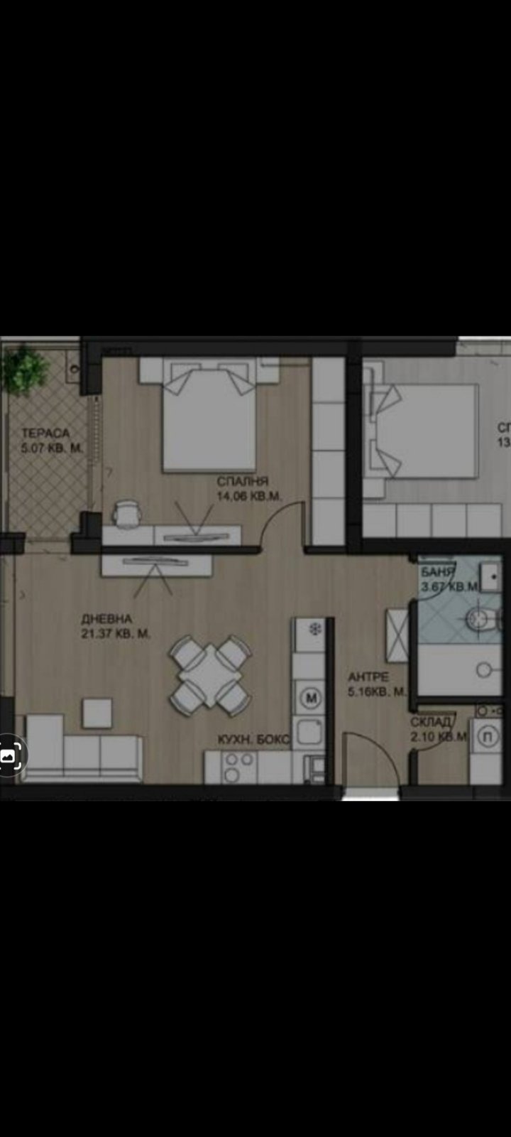 Апартаментът е със следното разпределение: всекидневна с кухненски бокс, спалня, баня с тоалетна, антре, склад, тераса и мазе /3.51 кв.м/. За Ваше улеснение прилагаме чертеж на имота.