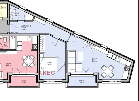 Апартаментът е с красиви панорами към Витоша и е разпределен на хол с кухня - 25 квм,балкон - 4 квм, спалня - 15 квм, баня - 4,5 квм.