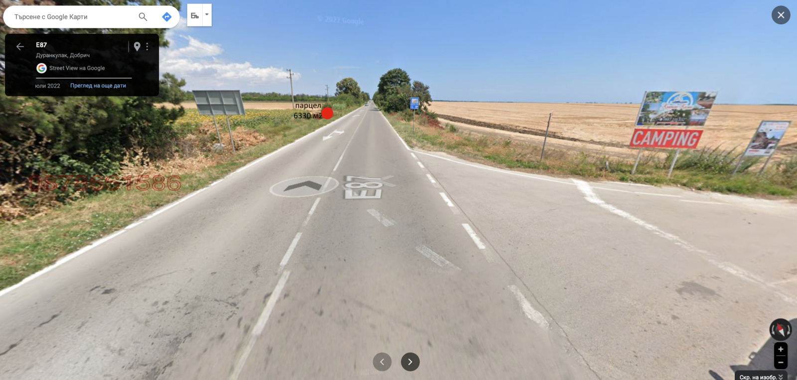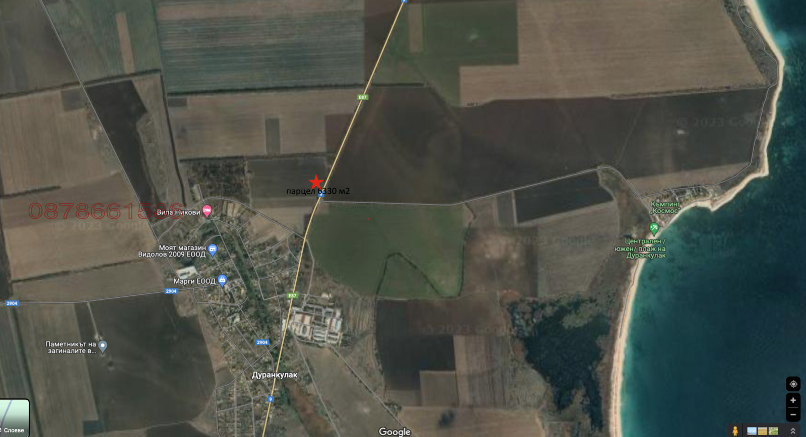 ИНВЕСТИЦИОНЕН ПАРЦЕЛ с лице 42 метра на главен път Е87 - европейския път за Румъния. В непосредствена близост до морето и Дуранкулашкото езеро. На разклона за къмпинга. В процедура по регулация. Равен. Отлична панорама.