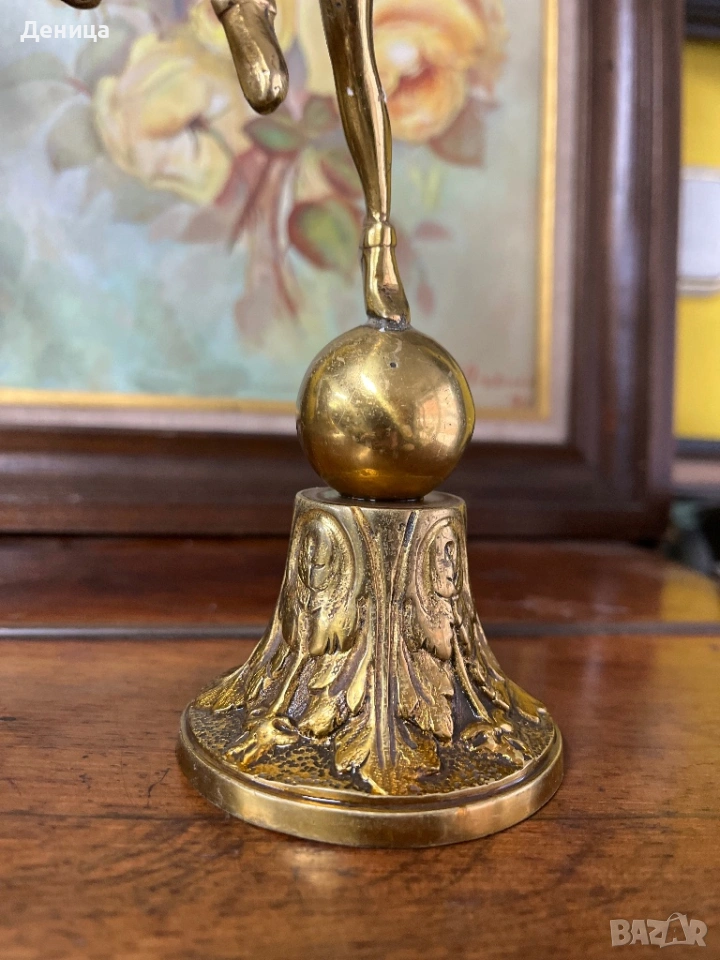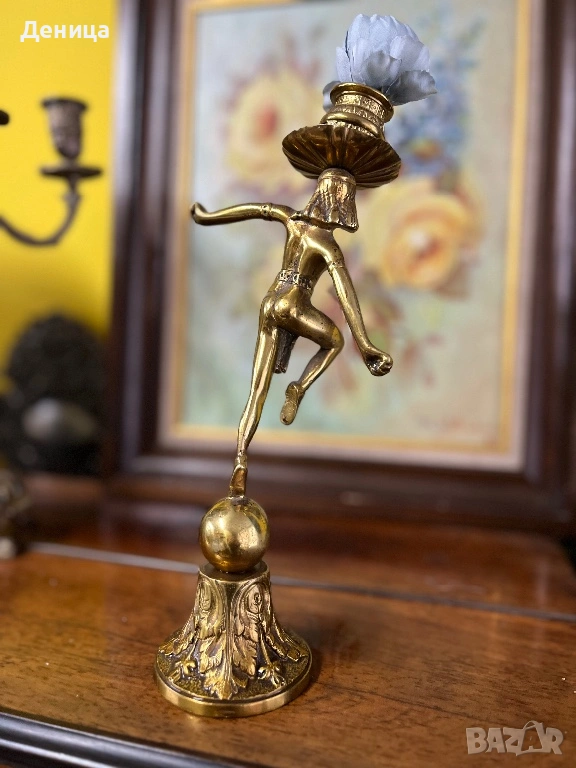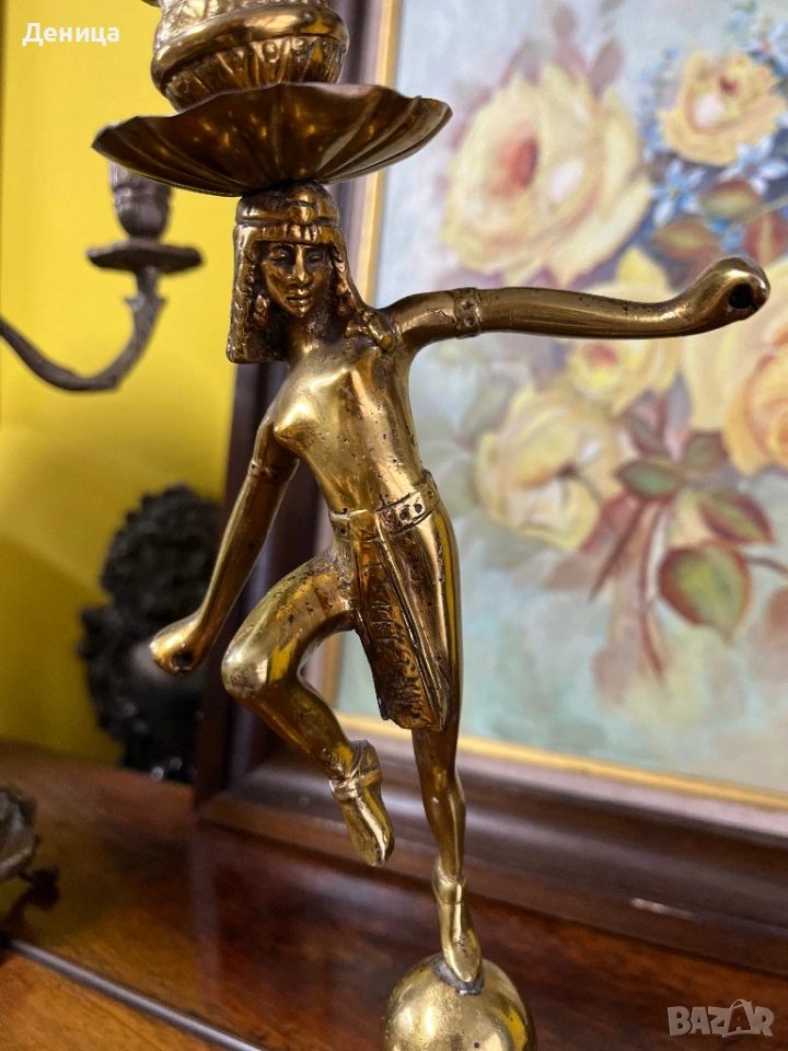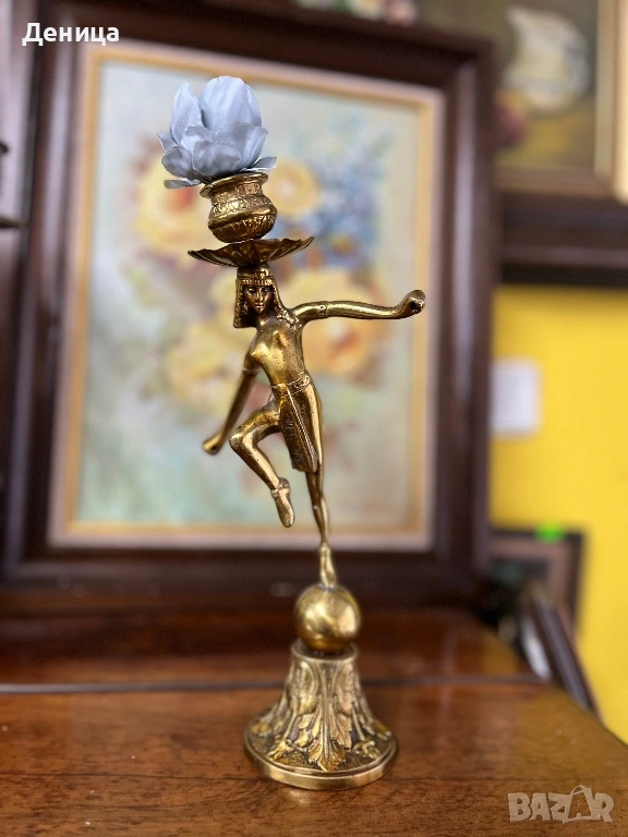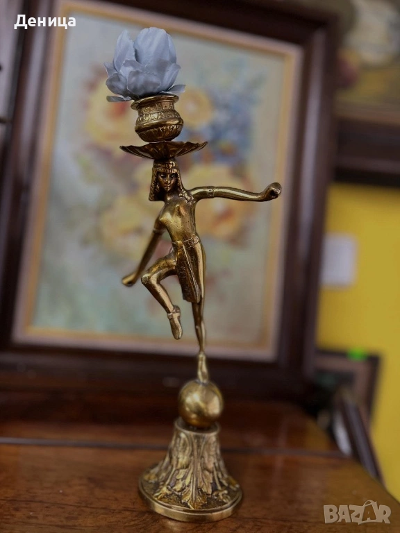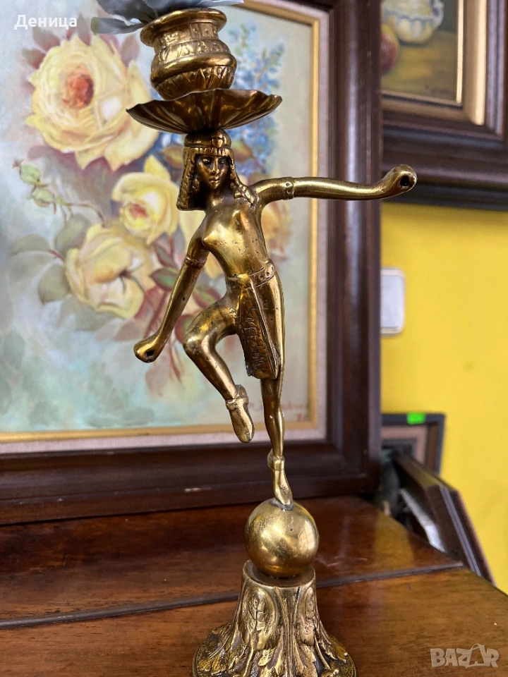 Бронзов / месингов свещник Египтянка, която балансира върху сфера, поставена върху основа → Обява 53689141