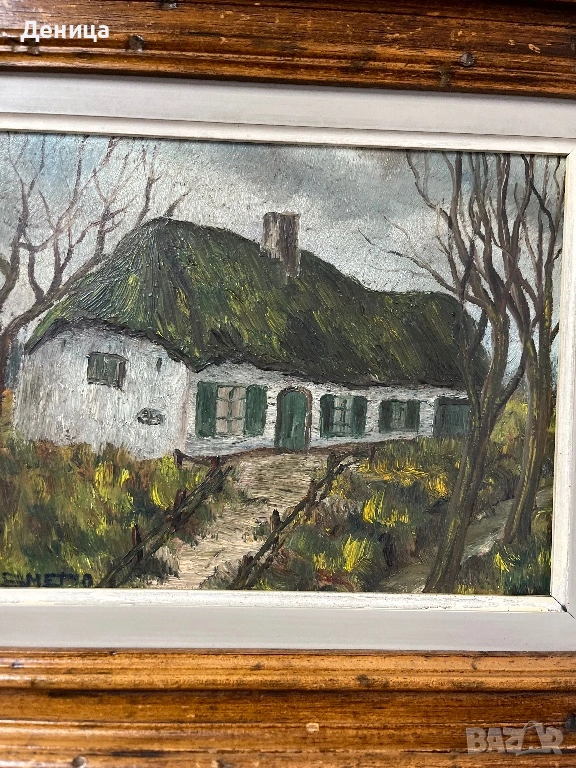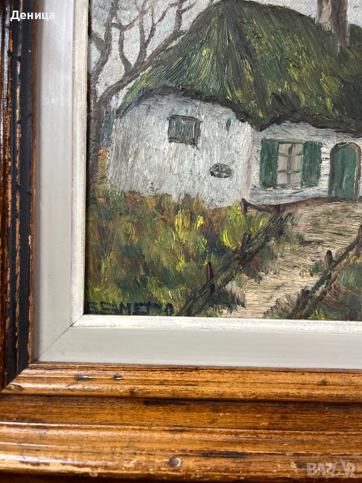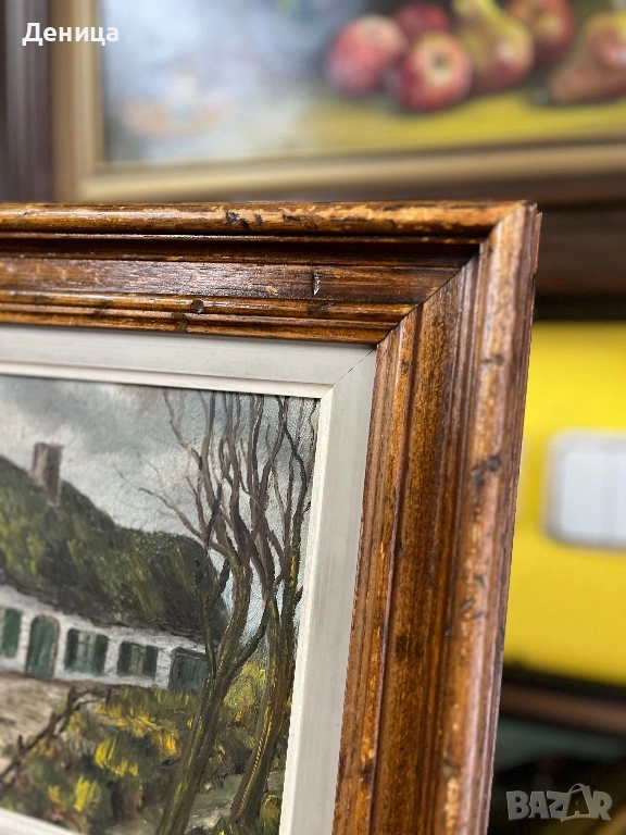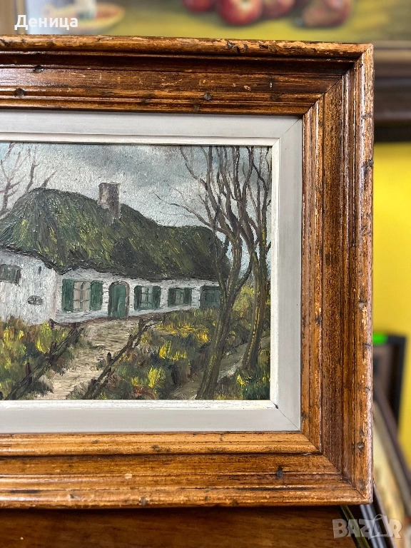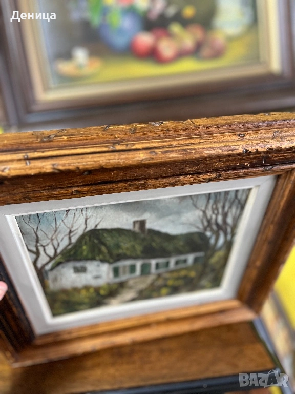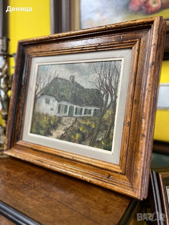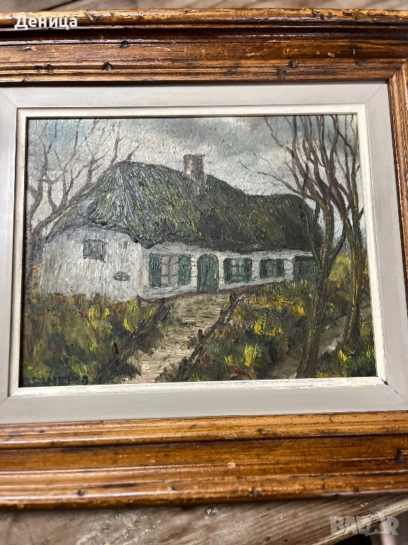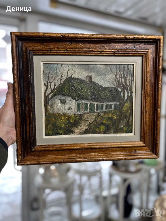 Рамката е жестока с всичките си почуквания и различното оцветяване на дървото и се допълва чудесно със сивото паспарту и зелените нюанси на самата картина