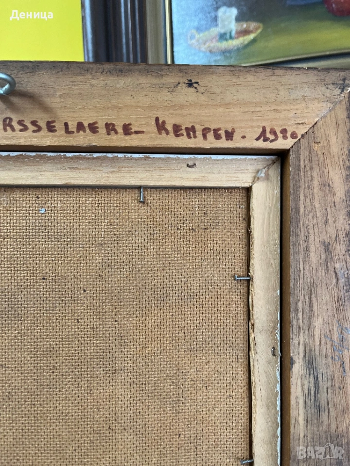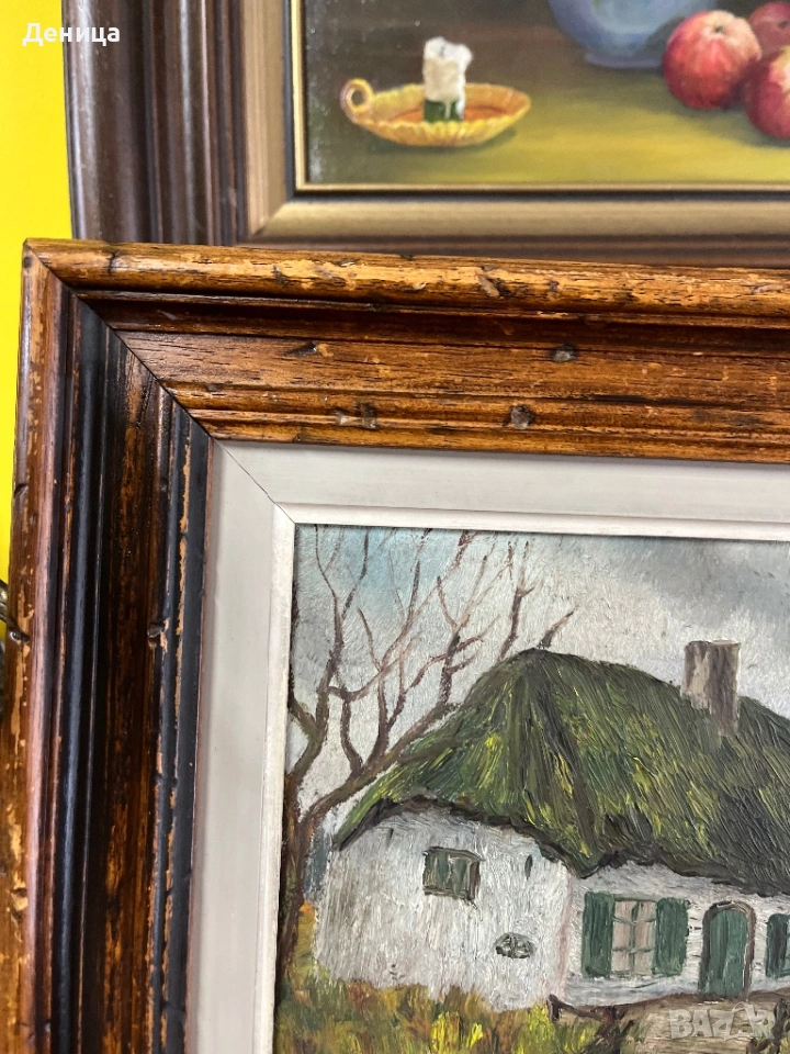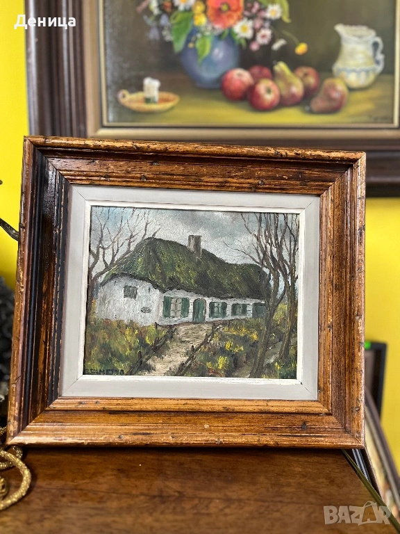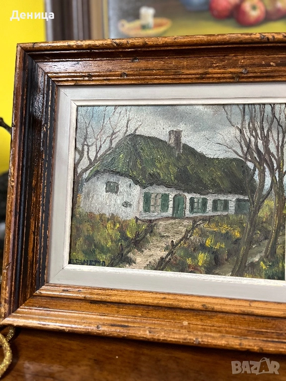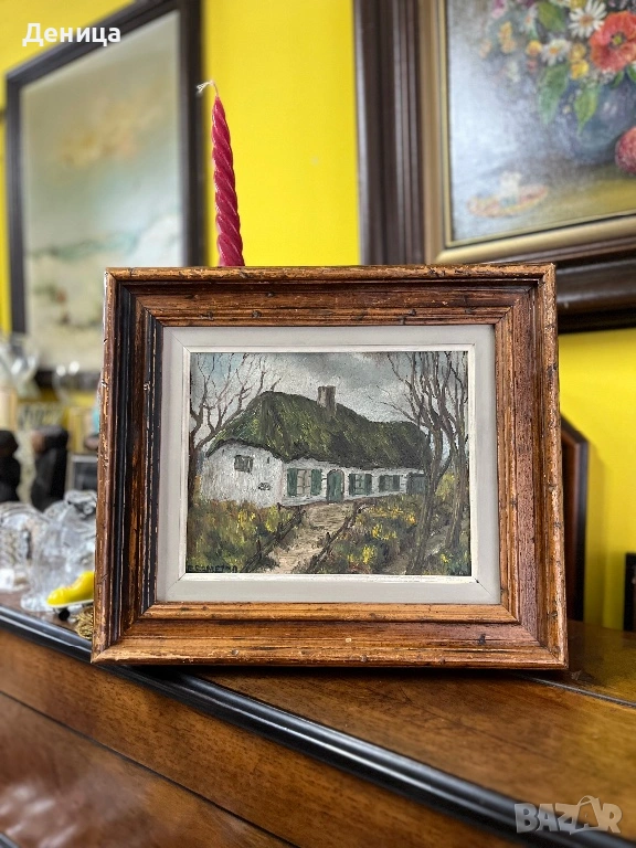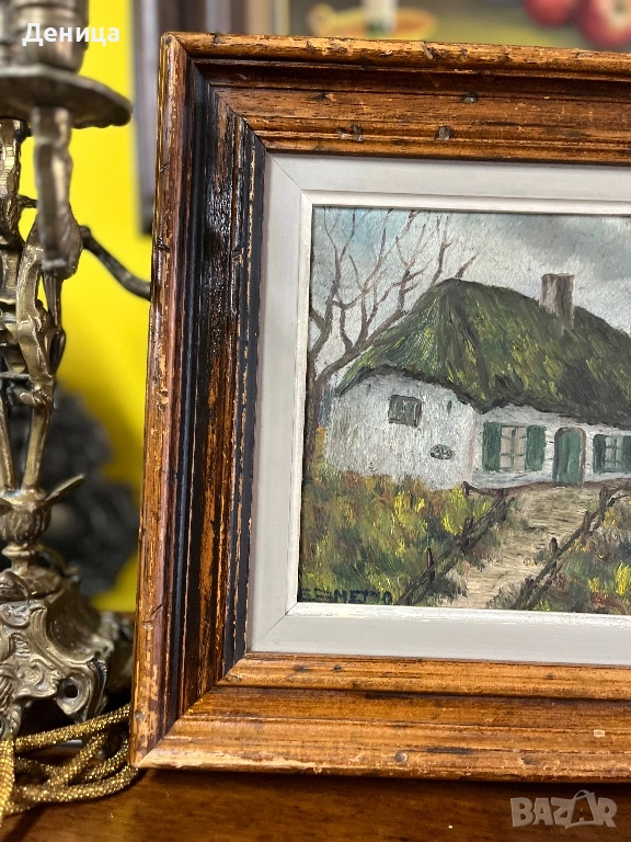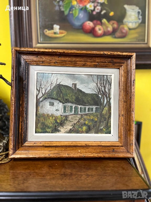 Рамката е жестока с всичките си почуквания и различното оцветяване на дървото и се допълва чудесно със сивото паспарту и зелените нюанси на самата картина