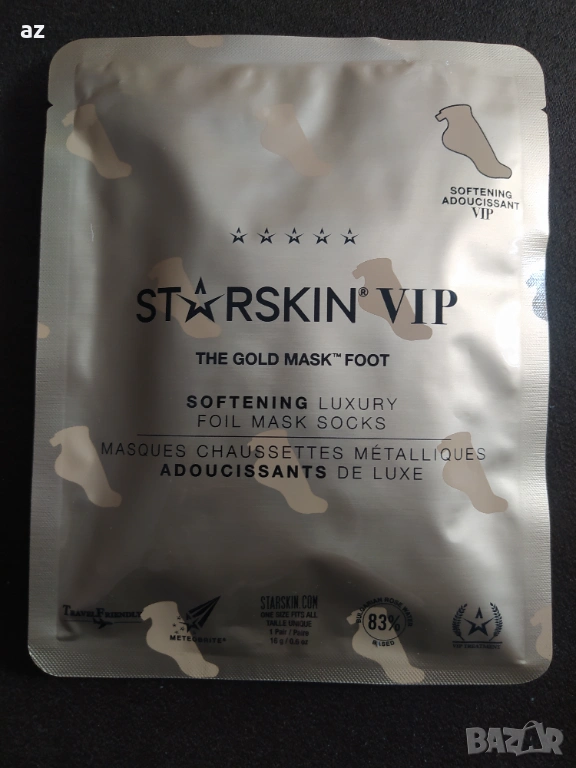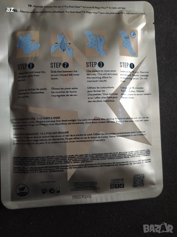 маска с висока концентрация на растителни екстракти, витамини и антиоксиданти, която обещава по-мека, гладка, ревитализирана и видимо освежена кожа след само 15 минути. Специално създадена под формата на чорапи, тя има два слоя вътрешен, обогатен с българска роза и масла от ший и шипка, и външен, чиято цел е да засили абсорбирането на серума чрез затоплящ ефект. И така, този супер интересен продукт ти осигурява не само интензивна хидратация, възстановяване и усещане за комфорт, но и мини СПА изживяване в домашни условия. Начин на употреба: Отвори сашето и раздели чорапите по отбелязаната линия. Постави предварително почистените и подсушени стъпала в чорапите и ги фиксирай с помощта на лепенките, за да активираш затоплящия ефект. След 15 минути отстрани и разнеси остатъчния серум чрез масажни движения. Без изплакване. За еднократна употреба. БЕЗ парабени и силикони. Веган и Cruelty-free. Внимание: Само за външна употреба. Състав: виж "Ingredients" на опаковката. Най-добър до: виж опаковката. Произход: Корея. Отговорно лице: Lafirgo, PРОВ 2925 1000 СХ, Холандия.