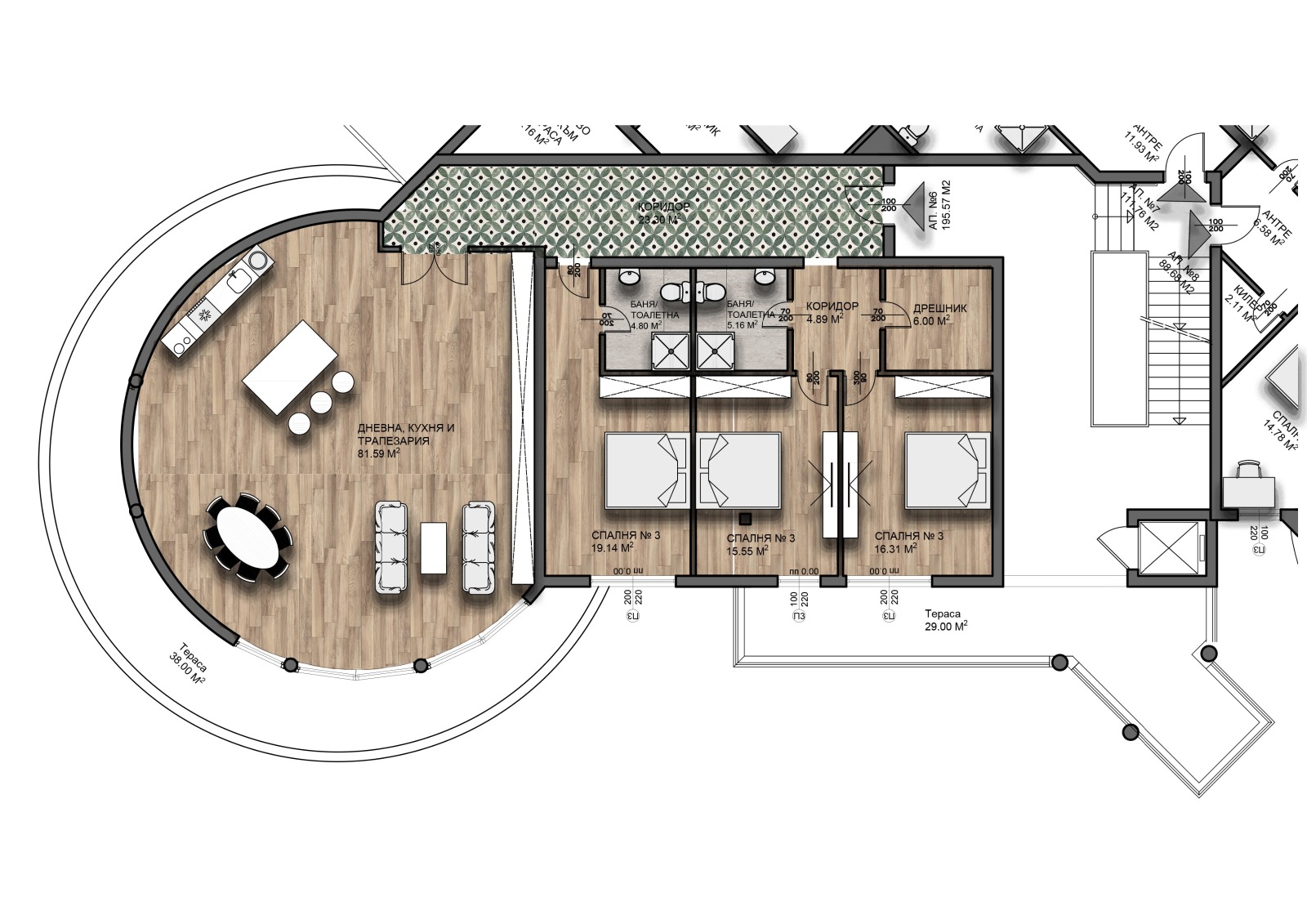 Сградата на комплекса е от затворен тип със SPA комплекс и басейн на приземния етаж. Апартаментът е на втори етаж, изключително просторен с чиста площ от 265,57 м². Състои се от коридор, просторна дневна с трапезария и кухня, три спални, дрешник, антре, две бани с тоалетна и две големи панорамни тераси. Имате възможност за допълнително закупуване на гараж или паркомясто.