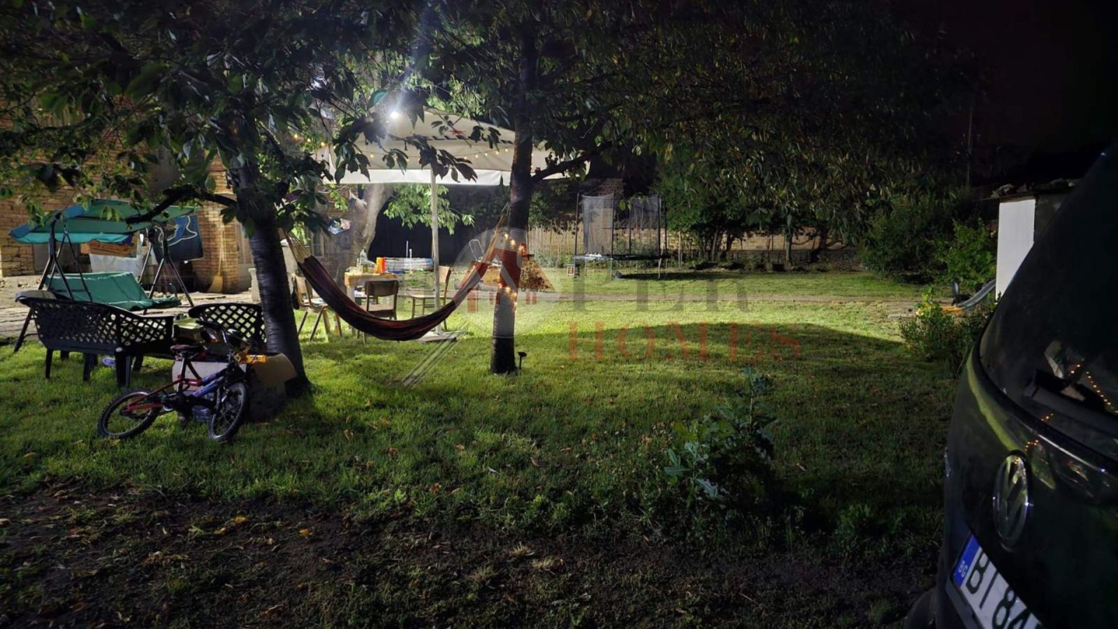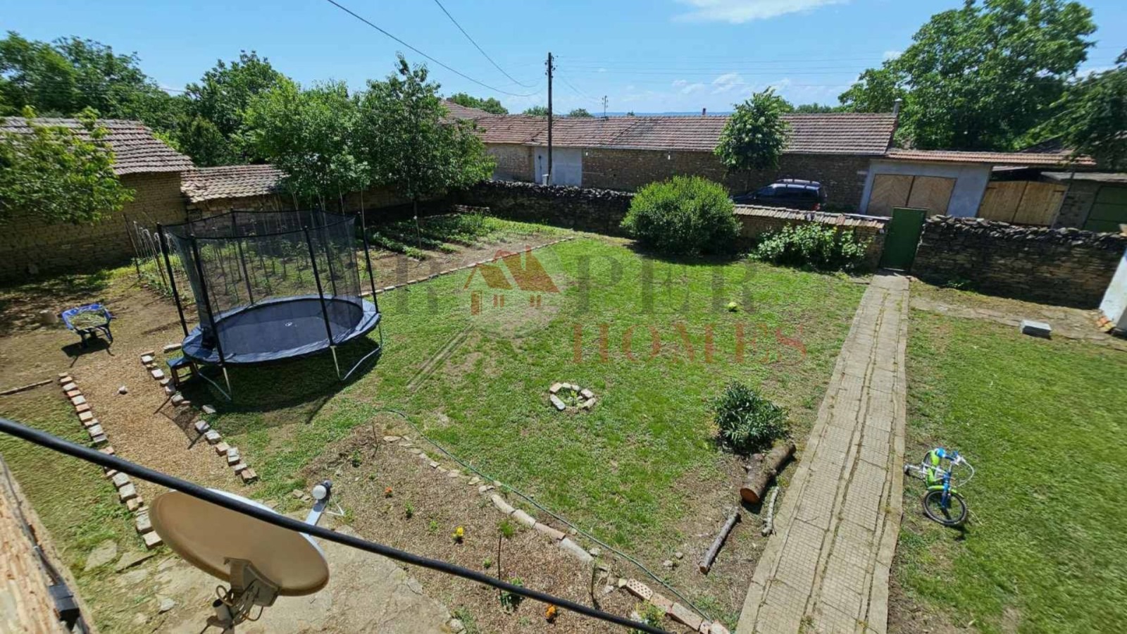 Дворното място е просторно и равно, с площ от около 1500 кв.м., напълно оградено и поддържано. В него има обособени зони за отдих, детски кът, място за градина и открит басейн, което го прави изключително подходящ за семейна почивка и живот сред природа.